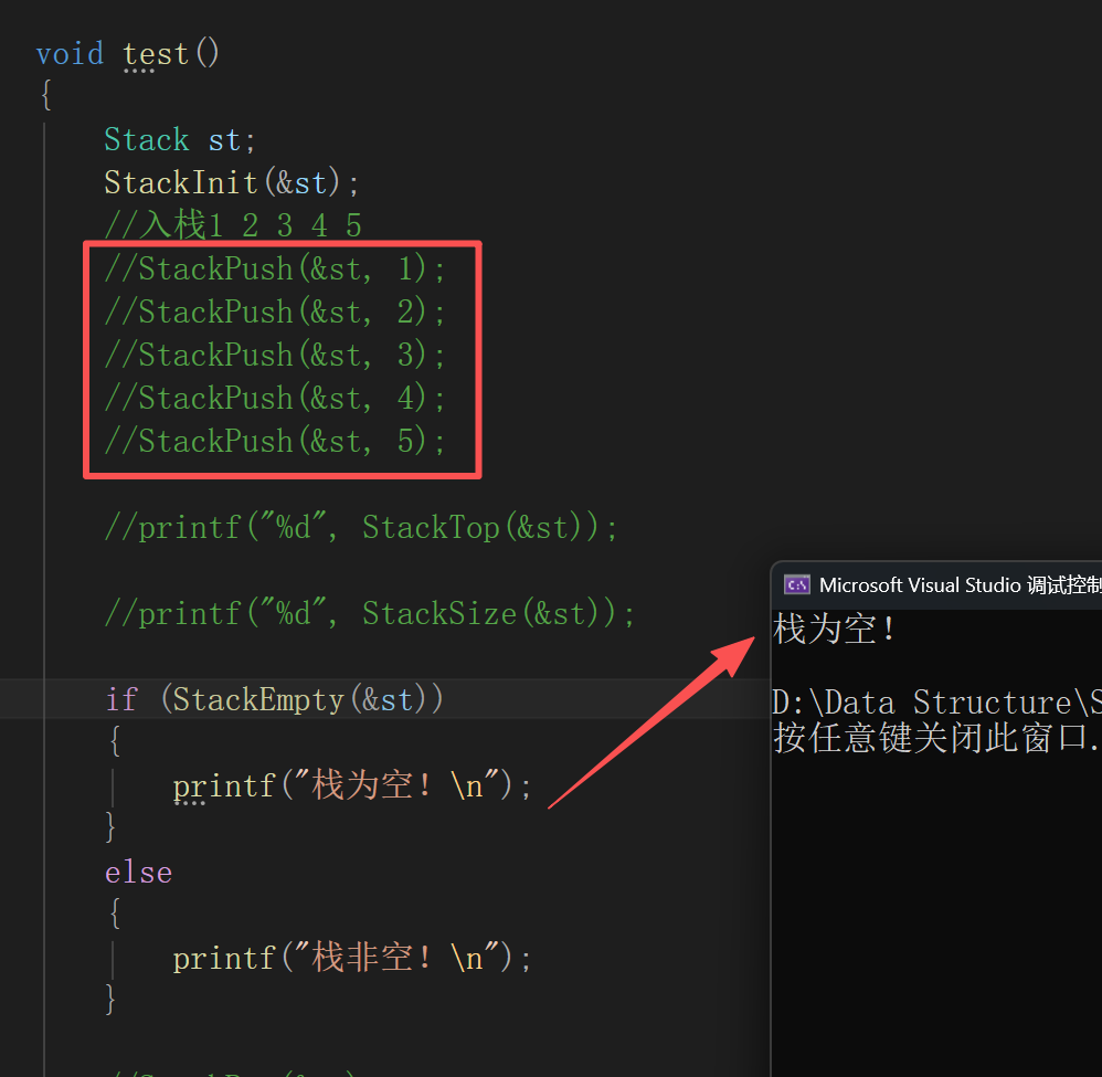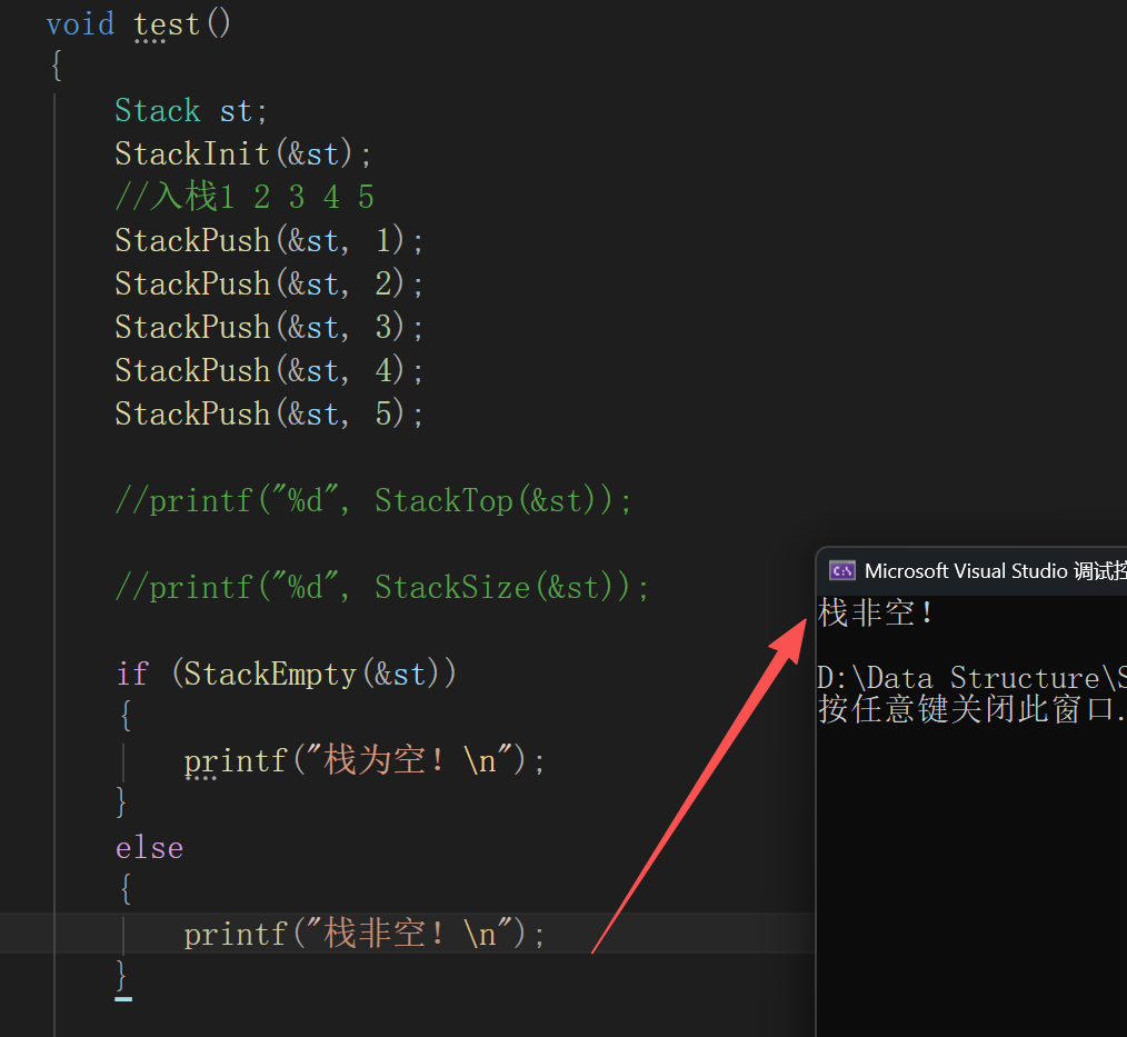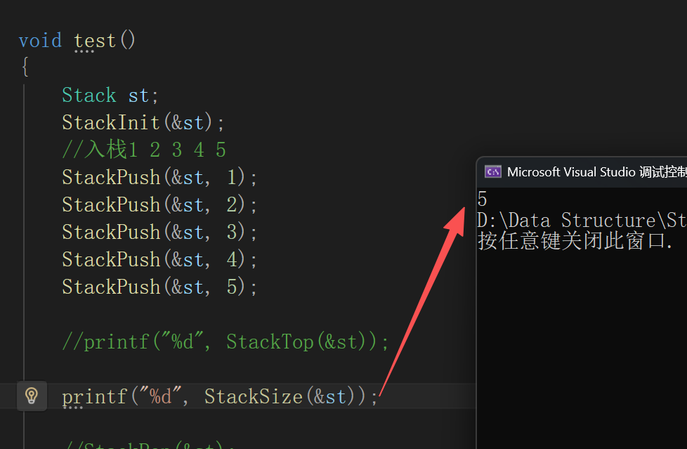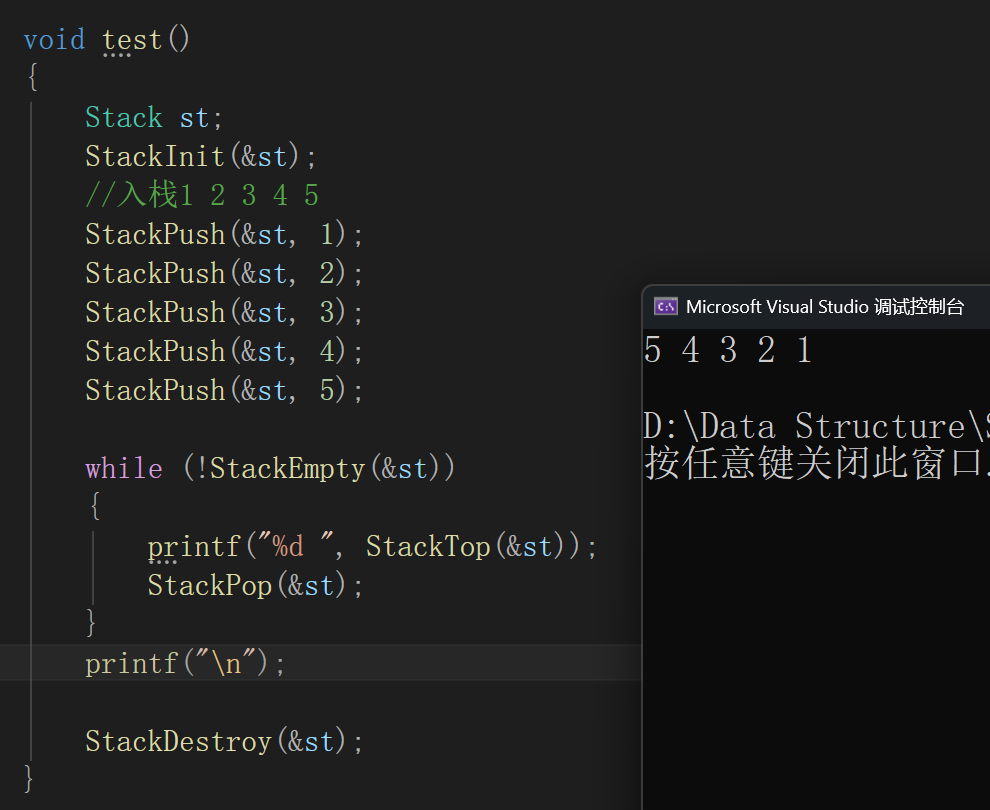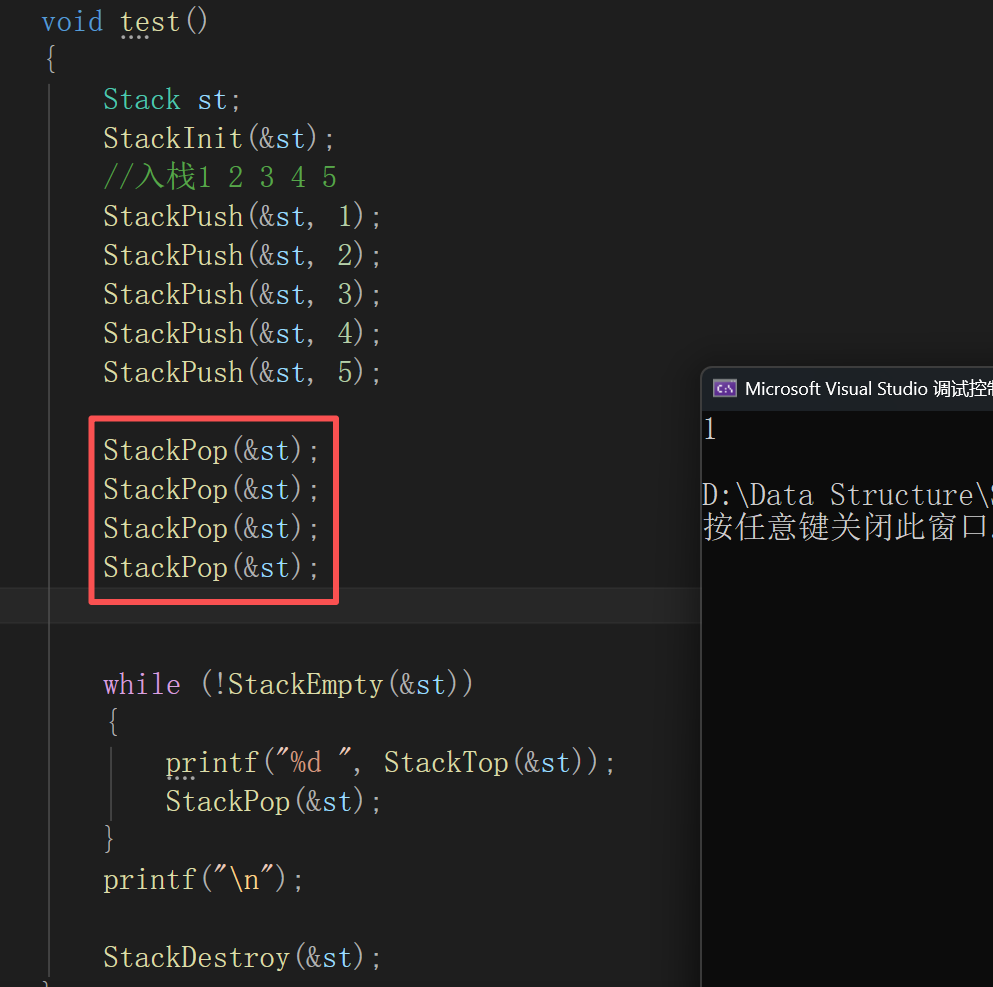 说明:由于栈的实现较为简单,因此所有函数都封装好之后再一起测试