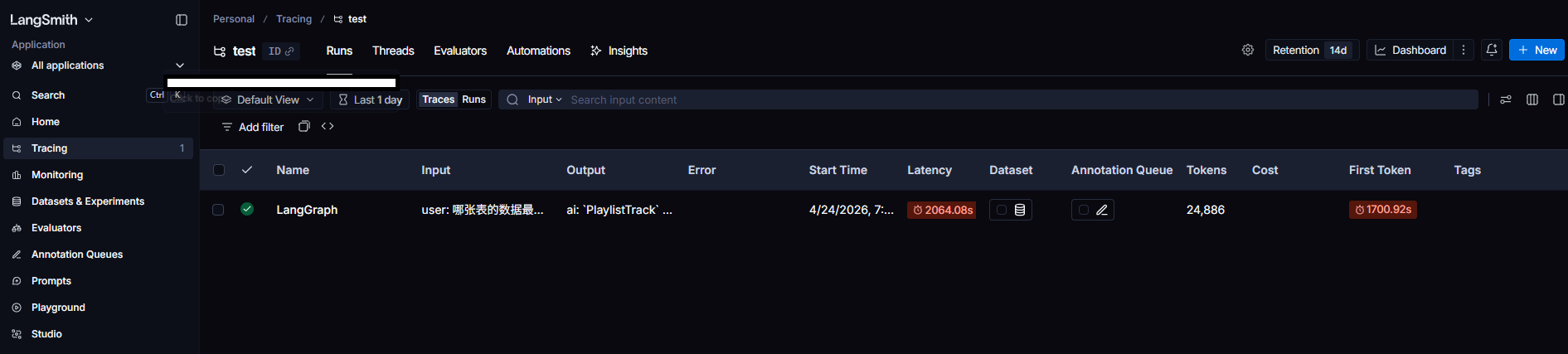 结论:测试结果与本地运行结果一致,但是快了不少,仅需23秒就搞定,可以看langsimth上的监控结果,如下图: