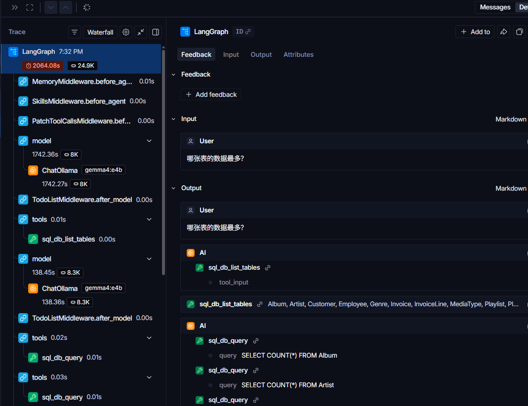结论:测试结果表明Agent可以根据用户指示查找对应问题的结果,但本地运行时间较慢,大约35分钟左右,可以看langsimth上的监控结果,如下图: