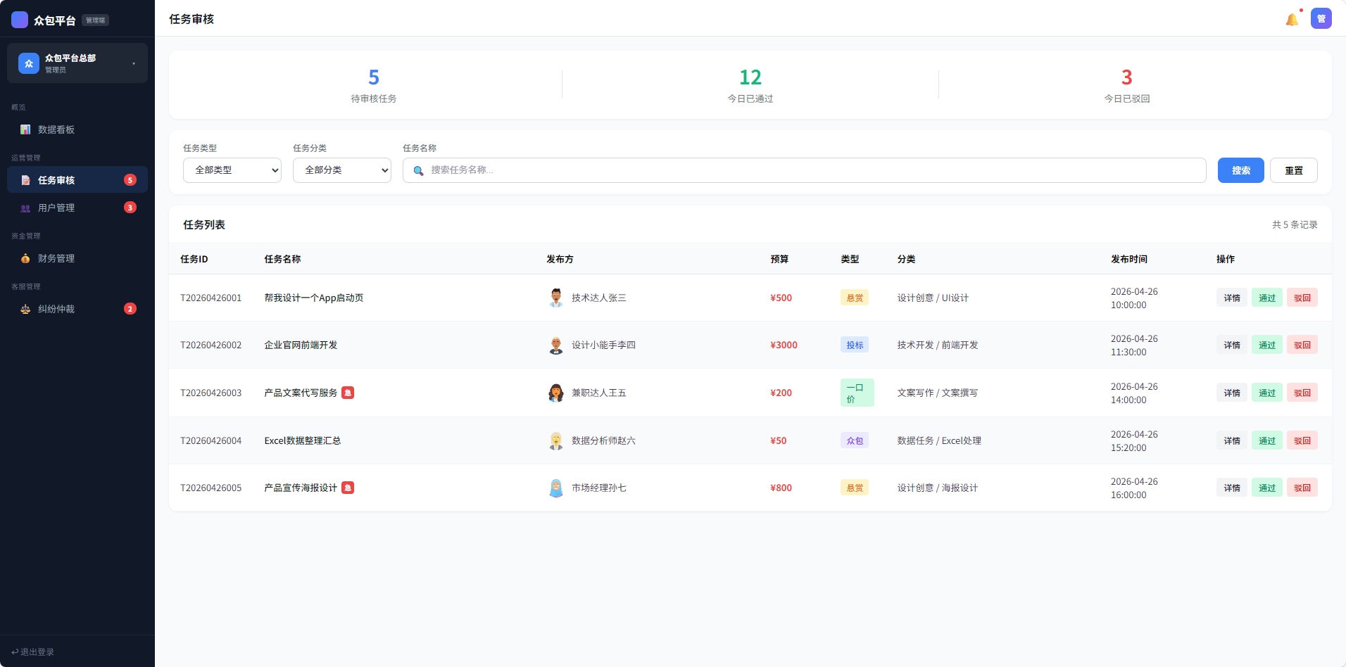 管理待发布任务的审核,支持查看任务详情、通过/驳回操作。驳回时需填写驳回原因。