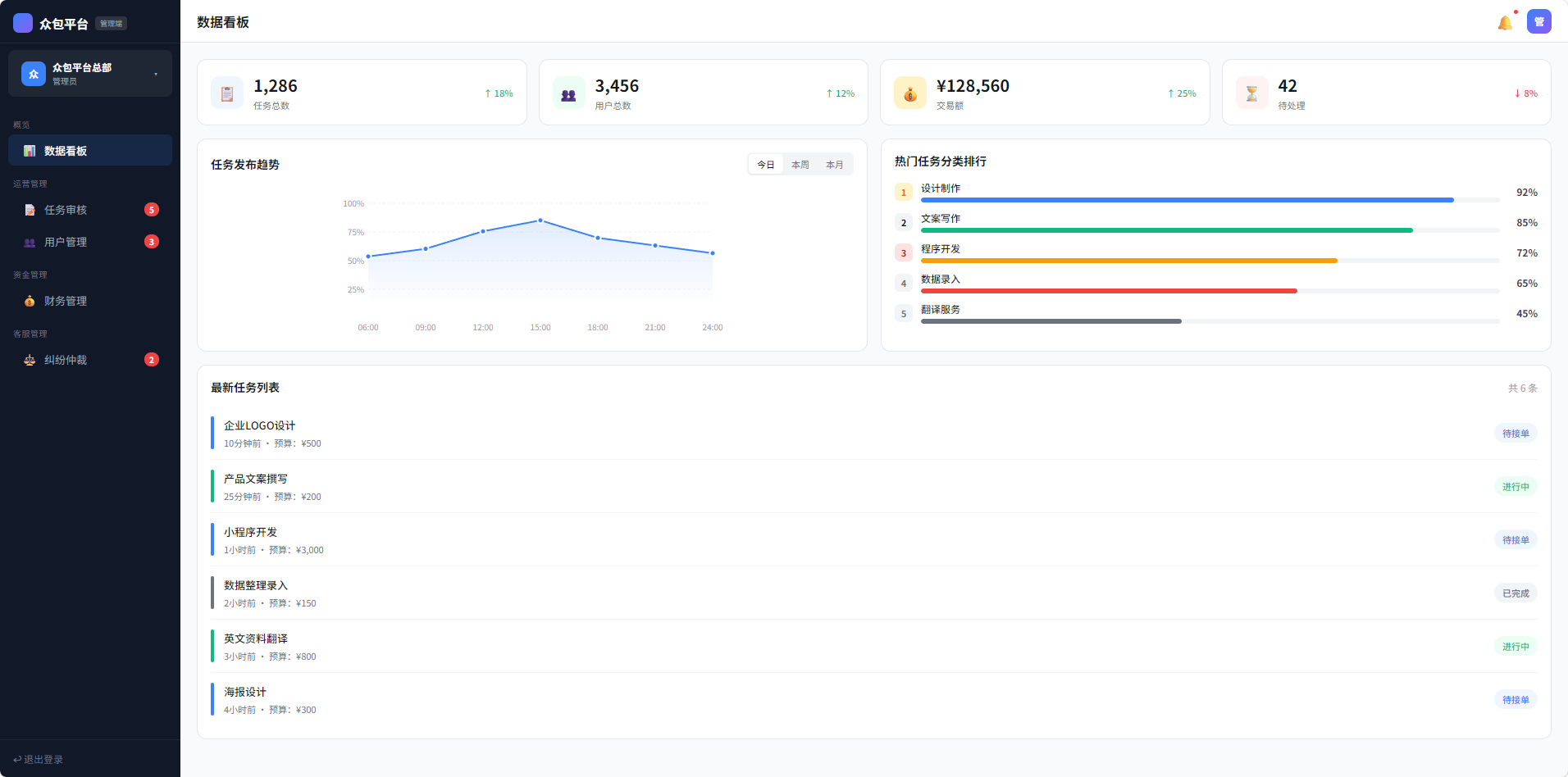 一个面向众包行业的任务交易与协作平台,覆盖任务发布方 + 服务方 + 管理后台,基于 Vue 3 构建。