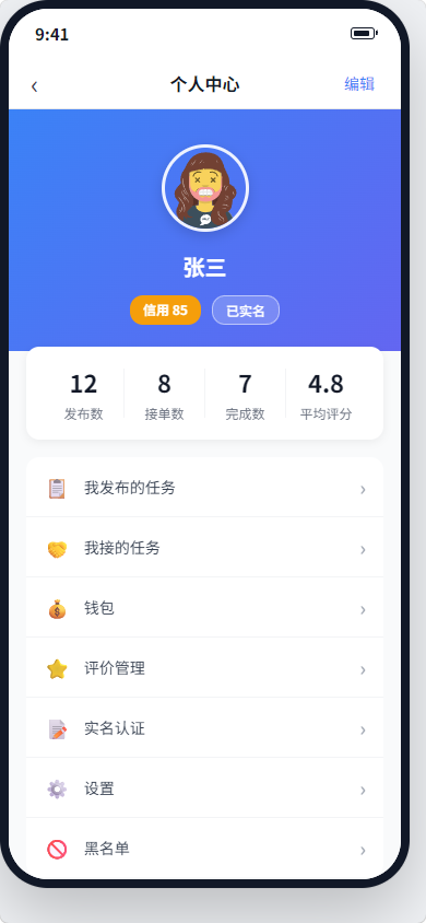 包含用户信息展示、实名认证状态、任务统计(发布数/接单数/完成数)、评价管理、设置等功能入口。