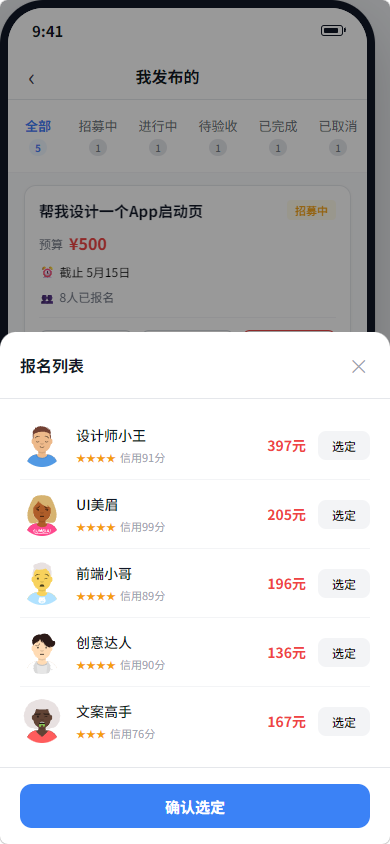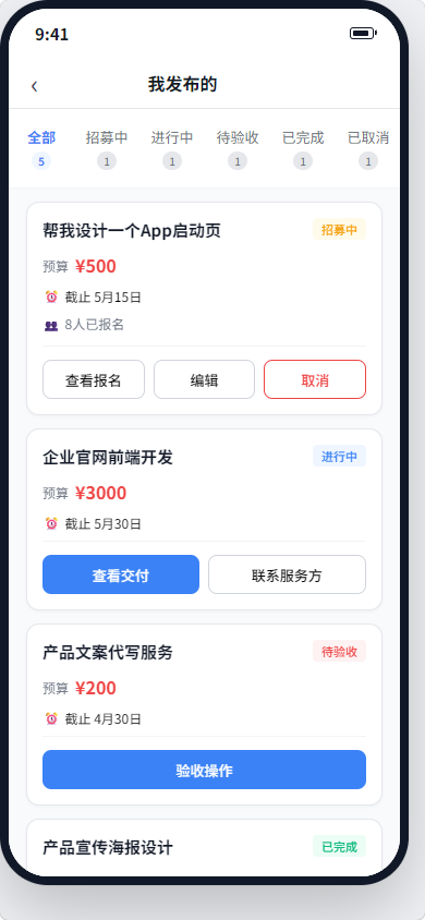 发布方可在"我的发布"中管理所有发布的任务,包括查看报名者列表、筛选报名者、开始合作、确认验收等操作。