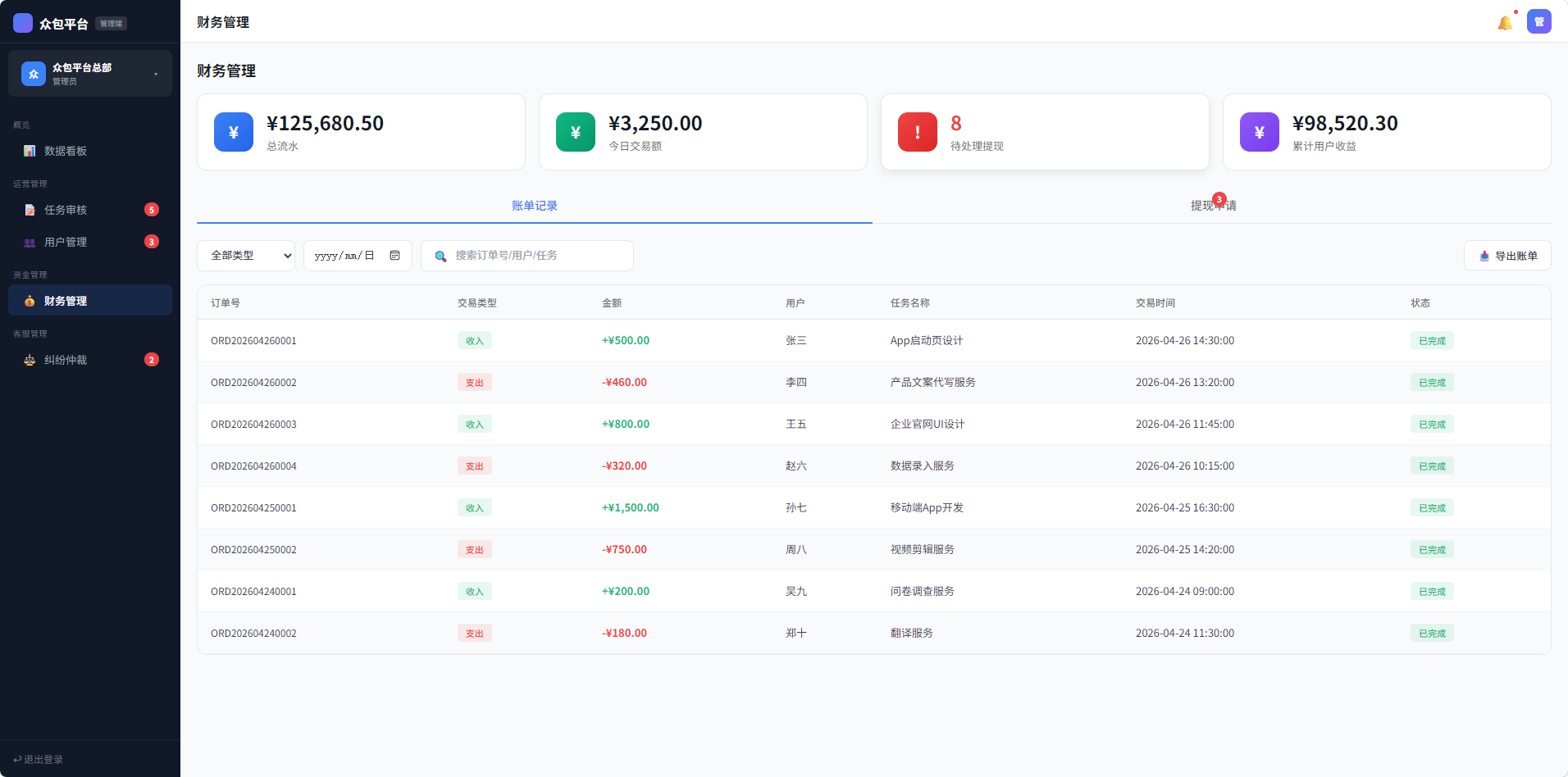 展示平台财务概览(总流水、今日交易额、待处理提现、累计用户收益)、提现申请审核、交易记录查询。