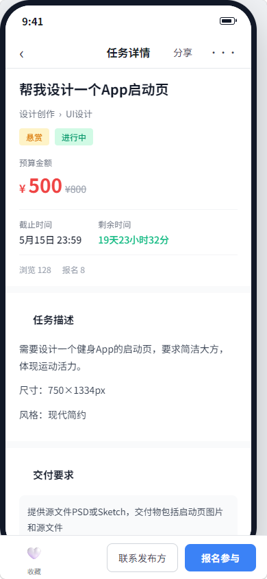 任务列表支持分类筛选、任务类型筛选(悬赏/投标/一口价/众包)、排序方式(最新/预算最高/距离最近)。任务详情页包含完整任务信息(标题、描述、预算、截止时间、技能要求)、发布方信息和报名入口。
