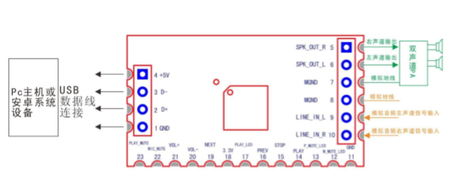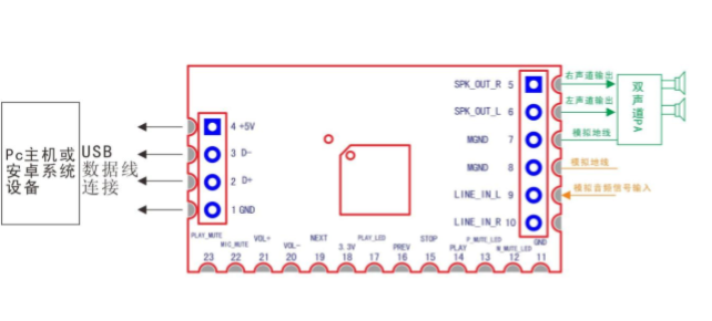 - 输出:默认双声道立体声,可直驱高阻抗耳塞,外接功放驱动扬声器;