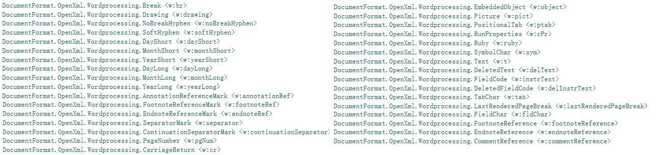 文本运行类Run是openxml中用于表示文本运行的核心类,命名空间为DocumentFormat. OpenXml.Wordprocessing,对应document.xml文件内的<w:r>元素,是段落内具有相同字符格式的最小文本单元,可以包含实际文本、换行符、图片、符号等内联内容。Run类支持添加下图所示的几十种子类型。