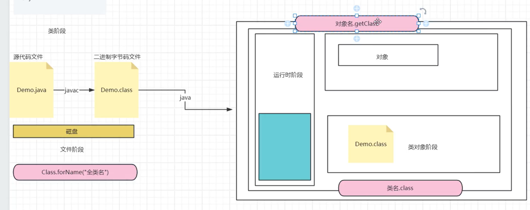 (1)磁盘文件阶段(如图左边)中使用的是:Class.forName("全类名"),这是一种在运行时动态加载类的方式