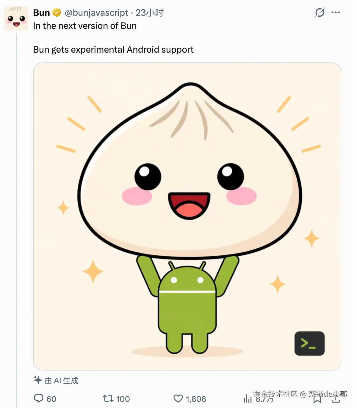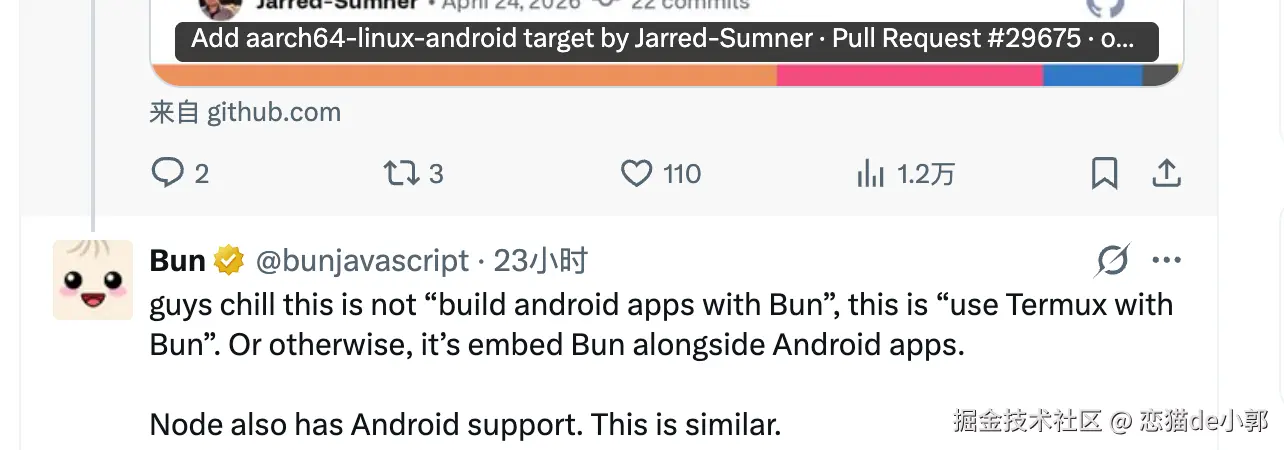 最近 Bun 官方正式宣布,下个版本 Bun 将正式支持 Android ,当然官方也说了,不要别把「能在 Android 手机上跑 Bun 」误解成「能用 Bun 开发 Android App 」,用 Bun 开发 Android App 毫无意义,它的定位更多是和 Node.js 的 Android 支持类似,本质是官方把 Bun 这个 JS 运行时移植到了 Android 平台。