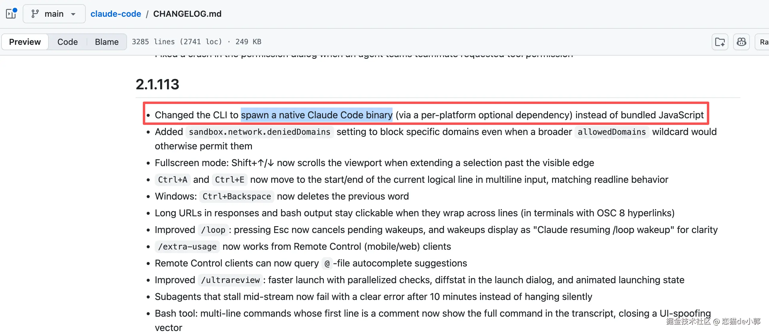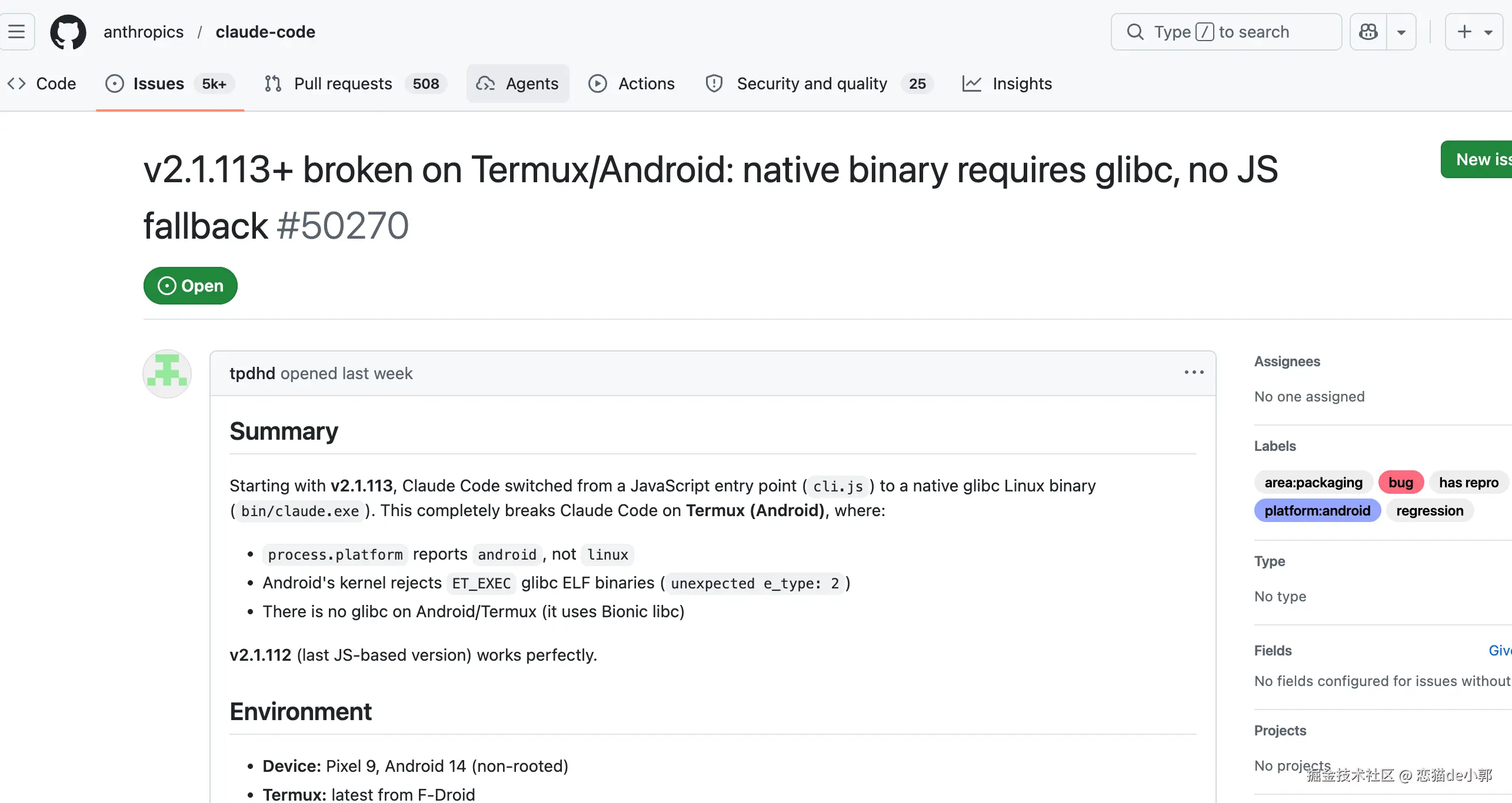 另外,Claude Code 从 v2.1.113 版本开始就切换到原生可执行二进制,不再是纯 Node.js,这样导致之前 Node.js 的 Termux/Android 上支持 Claude Code 无法正常工作: