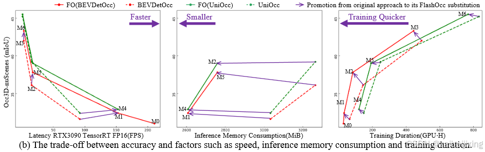 Figure 1. (a) illustrates how to achieve the proposed FlashOcc in plug-and-play manner. Contemporary approaches predict occupancy using voxel-level 3D feature processed by 3D-Conv. In contrast, our plugin substitute model achieves rapid and memory-efficient occupancy prediction by (1) replacing the 3D-Conv with 2D-Conv and (2) substituting the occupancy logits derived from the 3D-Conv with the Channel-to-Height transformation of BEV-level features acquired through 2D-Conv. The abbreviation "Conv" represents convolution. (b) exemplifies the trade-off between accuracy and factors such as speed, inference memory consumption, and training duration. The detailed configuration of M0-8 please consult to Table 2. "FO" is an acronym that stands for FlashOcc, and "FO(*****)" represents the plugin substitution for the corresponding model named with "*****". Best viewed in color.