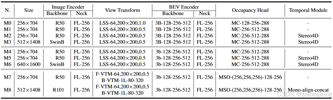 表 2:各种方法的详细设置。后缀"-number"表示该模块内的通道数,而"number × number"表示图像或特征的大小。"3B"和"1L"分别是 3 个瓶颈层和 1 个变换器层的缩写。"BE"是 bevformer 编码器的缩写。"MC"代表多卷积头。"FL"是 FPN LSS 的缩写。",number"表示深度 bin 的分辨率。F-VTM 和 B-VTM 分别表示[15]中的前向投影和深度感知后向投影。MSO 指的是[15]中描述的多尺度占用预测头,后缀"-(number,...,number)"表示多尺度输入特征的通道数列表。Stereo4D 指的是利用立体体积来增强 LSS 的深度预测,而不包含前一帧的 BEV 特征。Mono-align-concat 表示使用单目深度预测来增强 LSS,其中来自历史帧的 BEV 特征被对齐并沿通道连接。