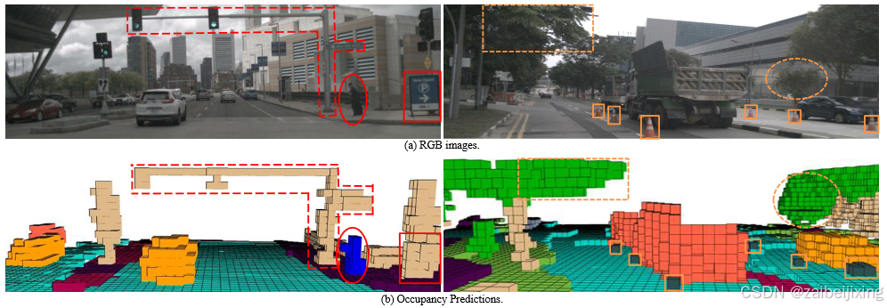 最近,新兴的占用预测任务通过预测三维空间中每个体素的语义类别来解决上述挑战[14, 10, 22, 23]。这种方法能够识别出不符合预定义类别的对象,并将其标记为一般对象。通过在体素级特征上操作,这些方法能够实现对场景的更详细表示,捕捉复杂的形状并解决目标检测中的长尾缺陷。