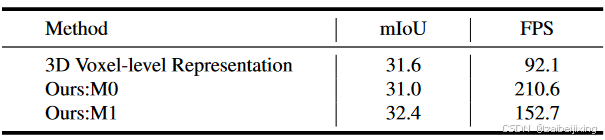表3:3D 体素级表示处理与高效通道到高度的比较。FPS 在 RTX3090 上使用 tensorrt 以 fp16 精度测试。