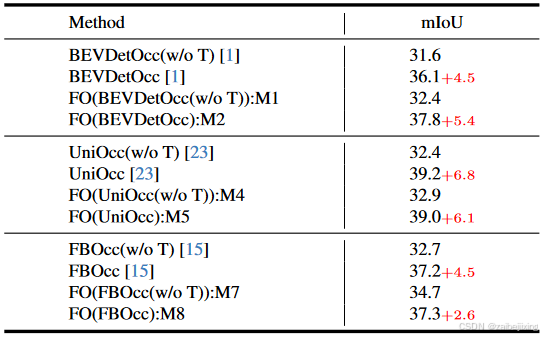 Training Details. As our FlashOcc is designed in a plug-and-play manner, and the generalization and efficiency are demonstrated on diverse mainstream voxel-based occupancy methodologies, i.e. BEVDetOcc [1], UniOcc [23] and FBOcc [15]. For a fair comparison, the training details are following the origin mainstream voxel-based occupancy methodologies strictly. As the channel number would be altered when replacing 3D convolution by 2D convolution, the detail architectures of respective plugin substitutions are presented in Table. 2. In the "Method" column of each experimental table, we use a ":" to associate each plugin substitution with its corresponding structure, i.e., M0-8. All models are traind using the AdamW optimizer [20], wherein a gradient clip is applied with learning rate 1e-4, with a total batch size of 64 distributed across 8 GPUS. The total training epoch for BEVDetOcc and UniOcc is set to 24, while FBOcc is trained for 20 epoch only. Class-balanced grouping and sampling is not used in all experiments.