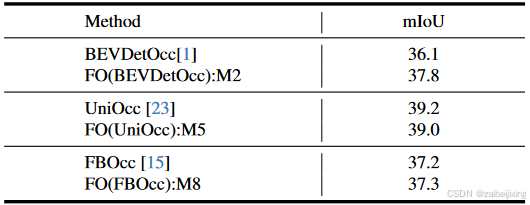 表4:我们即插即用的 FlashOcc 在各种流行的体素级占有率方法上的泛化演示。FPS 是在 RTX3090 上使用 tensorrt 以 fp16 精度测试的。缩写"FO"分别代表 FlashOcc。