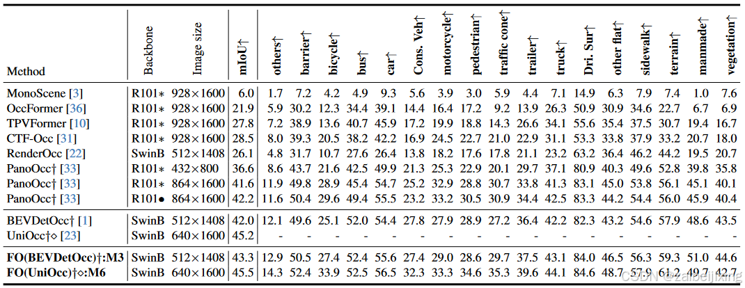 表 1:Occ3D-nuScenes 评估数据集上的3D占用预测性能。符号 ∗ 表示模型从预训练的 FCOS3D 主干初始化。"Cons. Veh"代表施工车辆,"Dri. Sur"是可行驶表面的缩写。"Train. Dur."是训练持续时间的缩写。"Mem."表示推理过程中的内存消耗。 ∙ 表示主干通过 nuScense 分割进行预训练。每秒帧数(FPS)指标使用 RTX3090 评估,采用 TensorRT 基准测试,使用 FP16 精度。"FO"是 FlashOcc 的缩写,"FO(*****)"表示用"*****"命名的相应模型的插件替换。 † 表示在训练中利用相机掩码进行性能报告。符号 ⋄ 表示使用类别平衡权重进行占用分类损失。