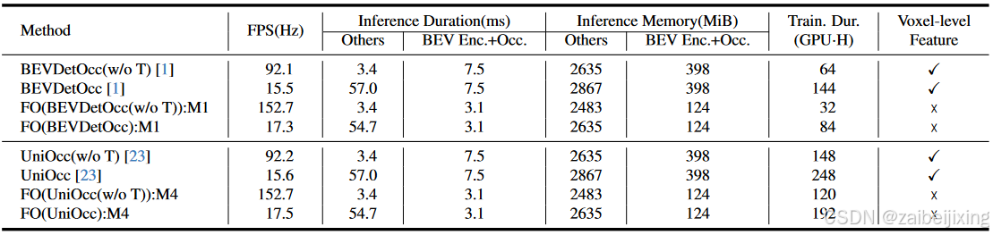 表6:训练和部署过程中的资源消耗分析。FPS 是在单个 RTX3090 上使用 tensorrt 以 fp16 精度测试的。"Train. Dur."是训练持续时间的缩写。"Enc."、"Occ."和"Feat"分别代表编码器、占用预测和特征。"GPU ⋅ H"表示"1 GPU × 1 Hour"。