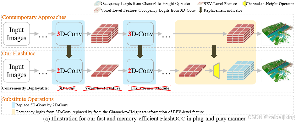 Inspired by sub-pixel convolution techniques [26], where image-upsampling is replaced by channel rearrangement, thus a Channel-to-Spatial feature transformation is achieved. Correspondly, in our work, we aim to implement a Channel-to-Height feature transformation efficiently. Given the advancement in BEV perception tasks, where each pixel in the BEV representation contains information about all objects in the corresponding pillar along height dimension, we intuitively utilize Channel-to-Height transformation for reshaping the flattened BEV features into three-dimensional voxel-level occupancy logits. Consequently, we focus on enhancing existing models in a general and plug-and-play manner, instead of developing novel model architectures, as listed in Figure. LABEL:fig:fig1 (a). Detially, we direct replace the 3D convolution in contemporary methodologies with 2D convolution, and replacing the occupancy logits derived from the 3D convolution output with the Channel-to-Height transformation of BEV-level features obtained via 2D convolution. These models not only achieves best trade-off between accuracy and time-consumption, but also demonstrates excellent deployment compatibility.