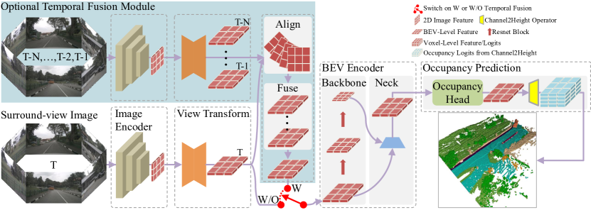 As depicted in Figure. 1, the BEV feature obtained from the neck for occupancy is fed into an occupancy head. It consists of a multi-layer convolutional network [1, 23, 22] or complex multi-scale feature fusion module [15], the latter exhibits a superior global receptive field, enabling a more comprehensive perception of the entire scene, while also providing finer characterization of local detailed features. The resulting BEV feature from the occupancy head is then passed through the Channel-to-Height module. This module performs a simple reshape operation along the channel dimension, transforming the BEV feature from a shape of B×C×W×H to occupancy logits with a shape of B×C∗×Z×W×H, where B, C, C∗, W, H, and Z represent the batch size, the channel number, the class number, the number of x/y/z dimensions in the 3D space respectively, and C=C∗×Z.