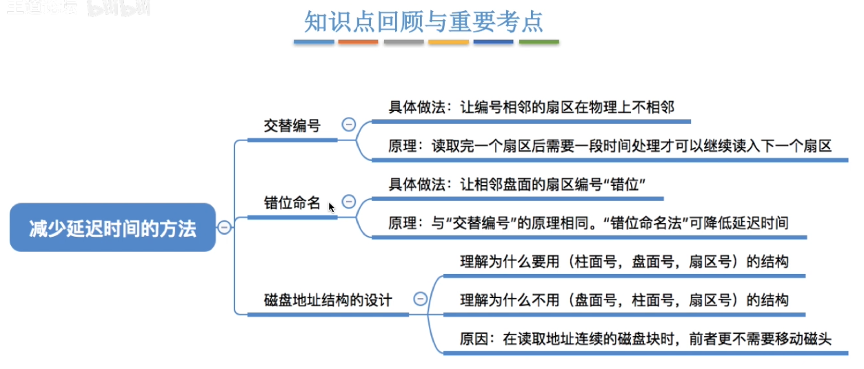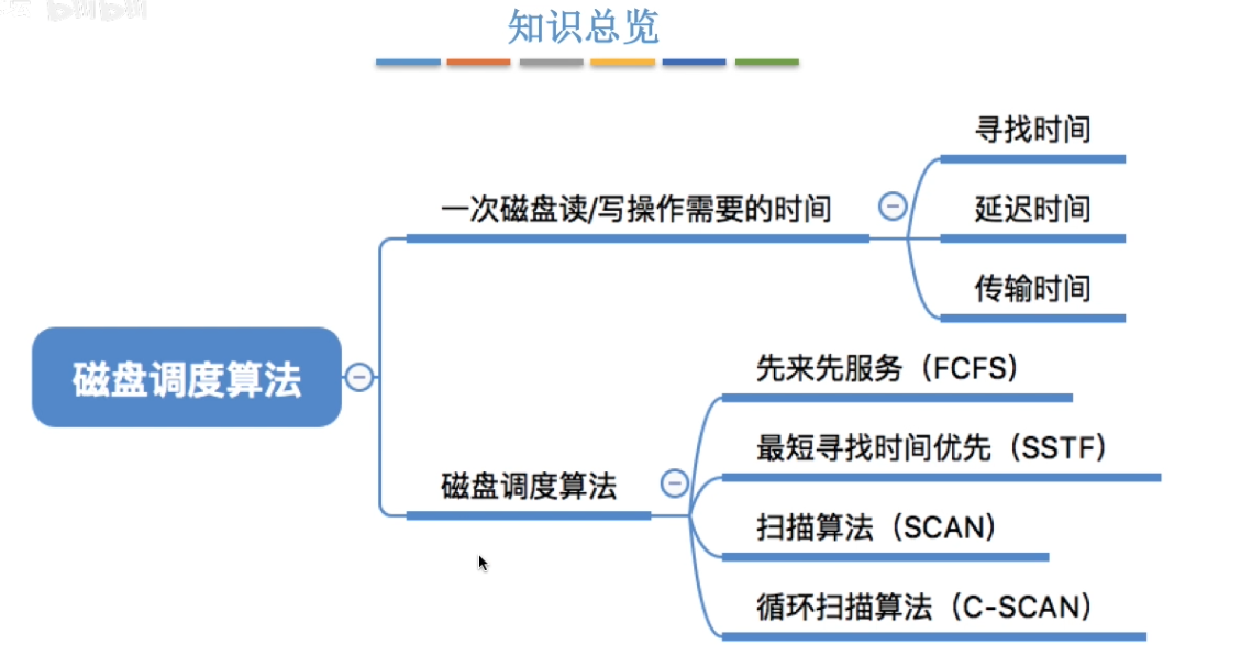 本节首先要掌握一次磁盘读/写操作需要多久的时间,应该怎么计算,计算时会从寻道时间、延迟时间和传输时间三个部分入手。而磁盘调度算法的不同会影响寻道时间的长短,所以选择一个合适的调度算法对磁盘整体的性能是有很大影响的。这里要重点掌握上图列出的四种算法。