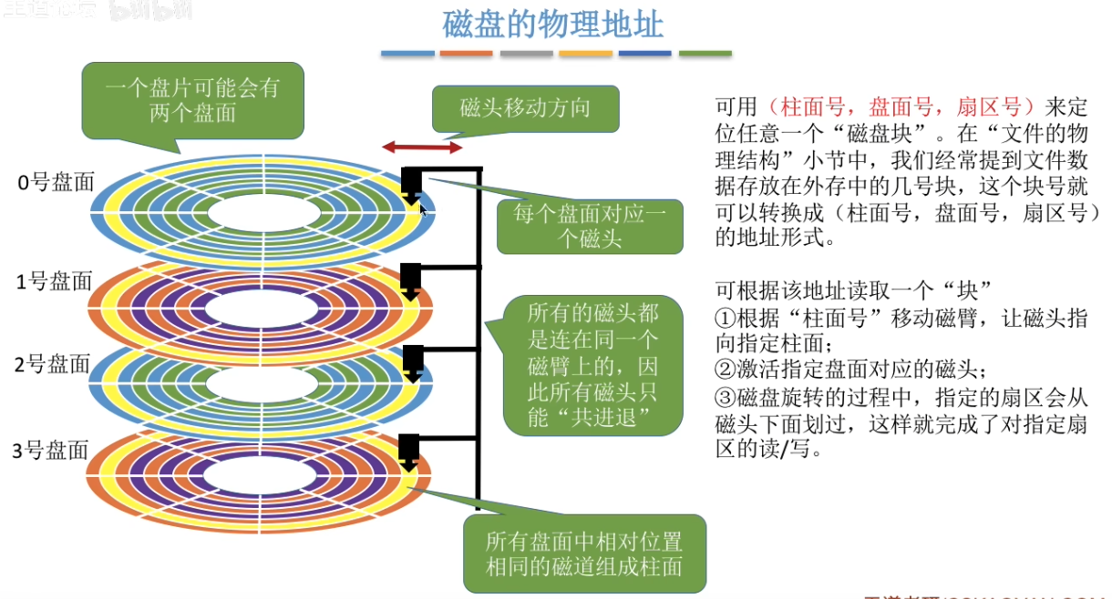 可用(柱面号,盘面号,扇区号)来定位任意一个"磁盘块"。其中柱面号用来定位盘面中某一个磁道,盘面号用来选择到底是哪一个盘面中的磁道,而扇区号用来选择在这个磁道中到底是哪一个扇区。在"文件的物理结构"小节中,我们经常提到文件数据存放在外存中的几号块,这个块号就可以转换成(柱面号,盘面号,扇区号)的地址形式。