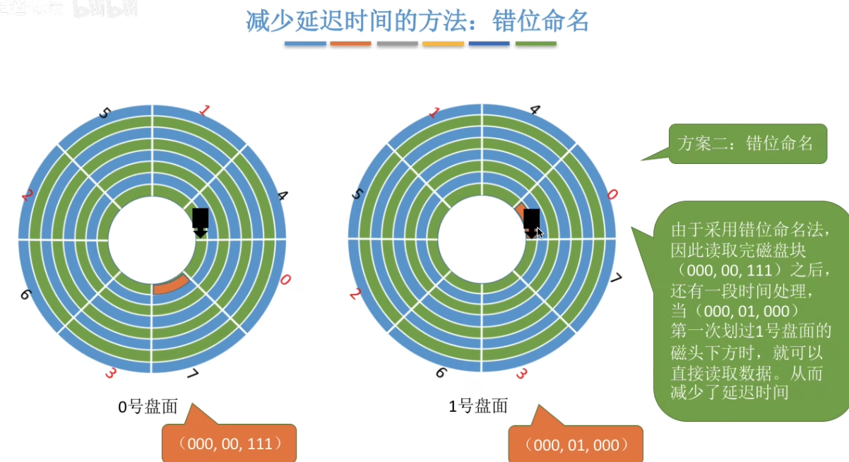 还是使用上面的例子作分析,由于采用错位命名法,因此读取完磁盘块( 000,00,111)之后,还有一段时间可以用于处理,当(000,01,000)第一次划过1号盘面的磁头下方时,就可以直接读取数据,从而减少了延迟时间。