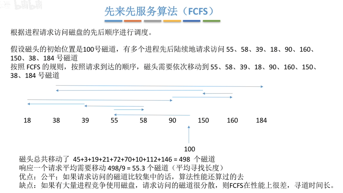 所以先来先服务算法的优点就是公平;如果请求访问的磁道比较集中的话,算法性能还可以。缺点是如果有大量进程竞争使用磁盘,请求访问的磁道很分散,则FCFS在性能上很差,会有很多时间浪费在寻道上。