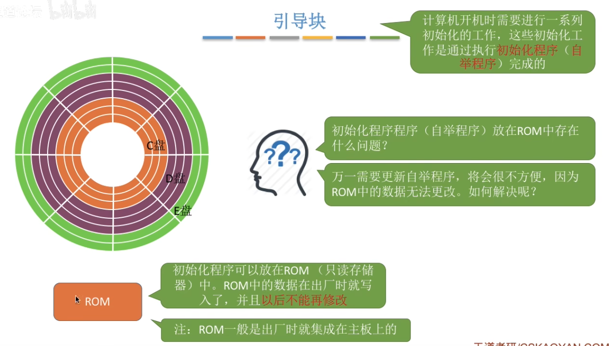 计算机开机时需要进行一系列初始化的工作(包括初始化CPU、内存等),这些初始化工作是通过执行初始化程序(自举程序)完成的。一般来说,初始化程序是存放在ROM(只读存储器)中的,而ROM中的数据在出厂时就写入了(一般来说,ROM在出厂时就直接集成在了电脑主板上),并且以后不能再修改。