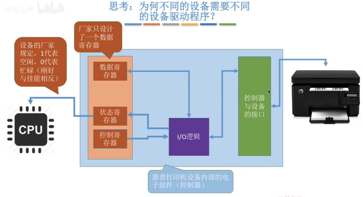 因此,I/O逻辑会负责接收和识别CPU的各种命令(如地址译码),在接收和识别了CPU的命令之后,I/O逻辑需要把它翻译成具体的设备能够明白的命令,然后通过控制器与设备之间的接口,发送给具体的设备,让设备执行相应的操作。
