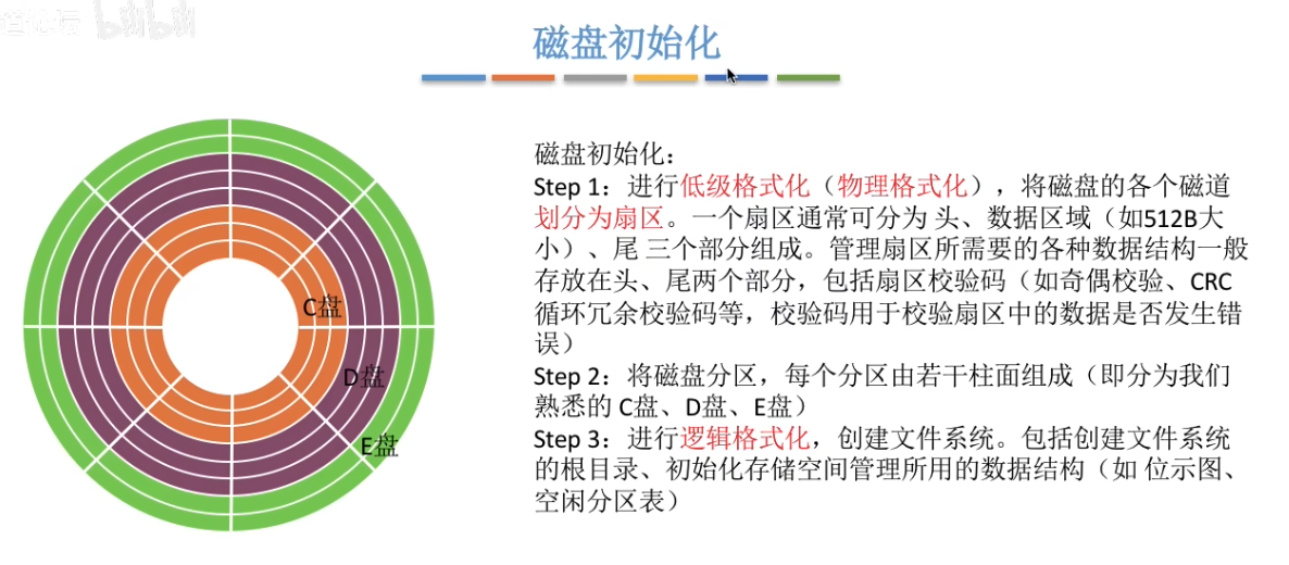 在正式使用磁盘之前,还需要对磁盘进行逻辑上的分区,每个分区由若干个相邻的柱面组成,这里所谓的分区就是我们平时熟悉的C盘、D盘等。