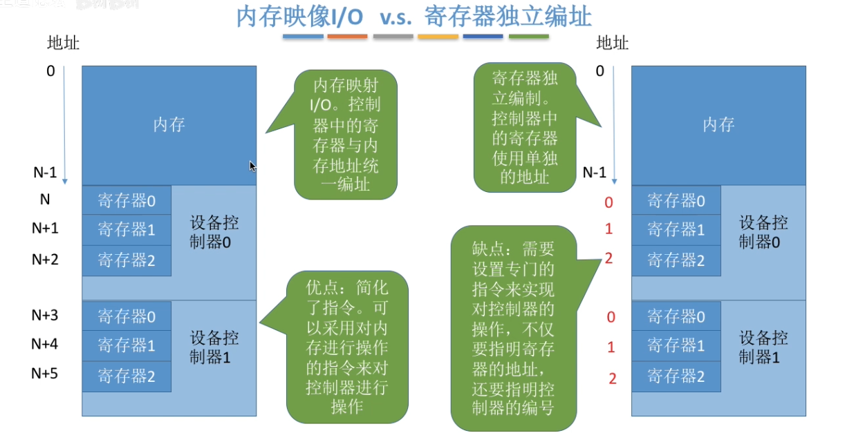 如果采用寄存器独立编址的话,内存编号仍是分别是0到N-1,如果有一个设备控制器有三个寄存器,这些寄存器又会从0开始进行编号,如上图右,相应的,如果还有别的寄存器也会从0开始编号。不过在有的系统当中,也有可能是各个设备控制器当中的寄存器用连续编号的方式。这些细节部分可以忽略,只需要知道寄存器独立编制,控制器中的寄存器与内存地址不统一编址。