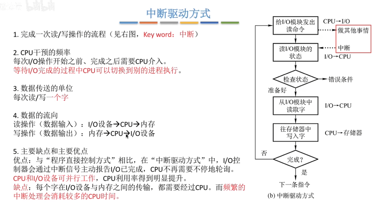 中断驱动方式的优点就是解决了程序直接控制方式的最大缺点,引入了中断技术之后,可以让CPU和I/O设备并行的工作,然后CPU不需要再不停地轮询来检查I/O是否完成。这样CPU和I/O设备的利用率都得到了明显的提升。