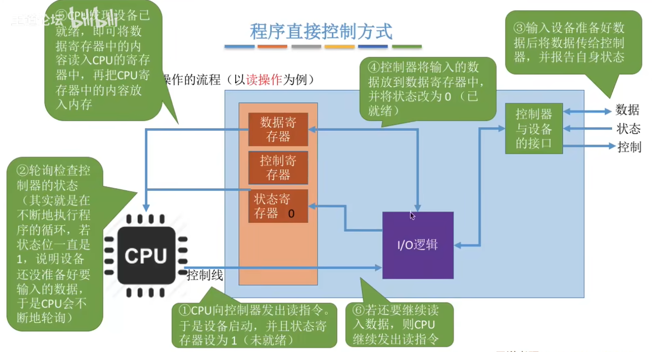 首先看一下CPU的干预频率,在使用程序直接控制方式的时候,CPU需要不断轮询检查I/O操作是否已经完成,所以CPU干预的频率是很频繁的,不仅在I/O操作开始之前和完成之后需要CPU的介入,在等待I/O完成的过程中,CPU也需要不断的轮询检查。这也是程序直接控制方式的最大一个缺点。