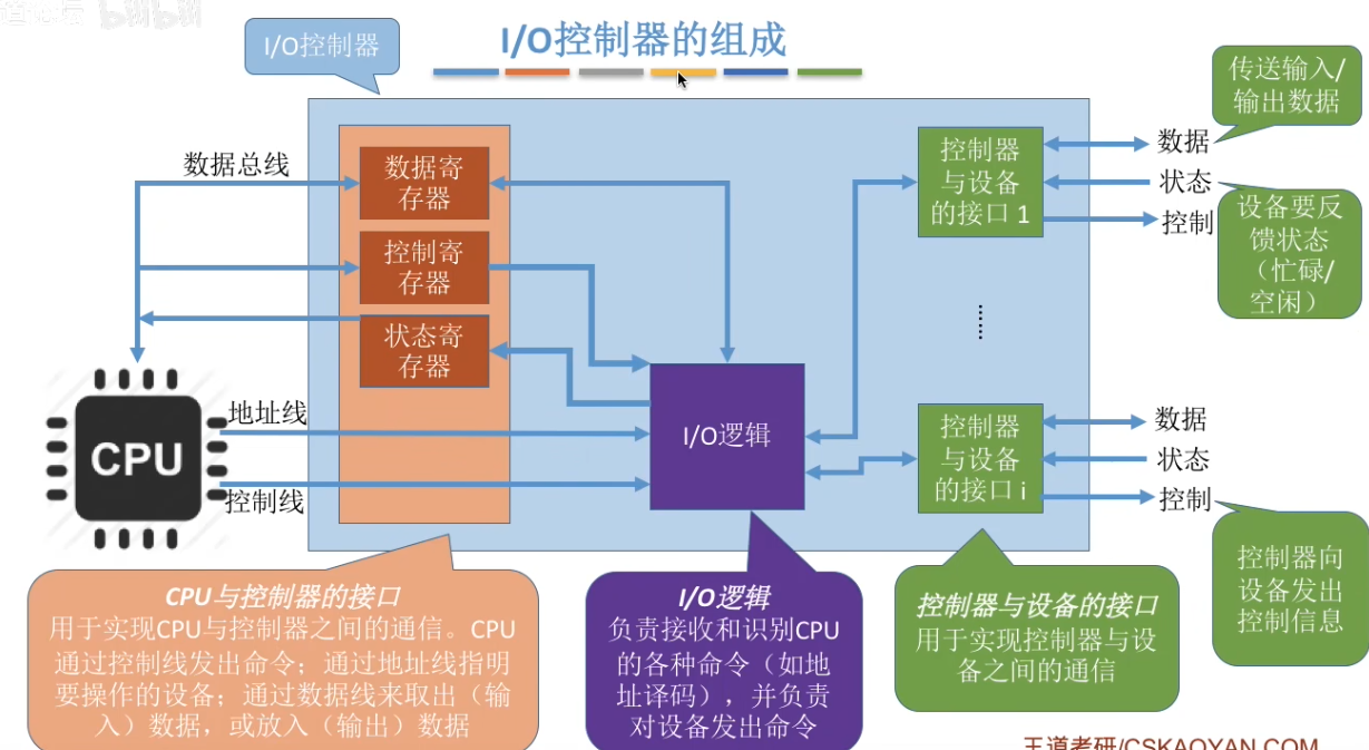 如上图,在2.I/O控制器里我们知道,一个I/O控制器有如上图右的结构组成。