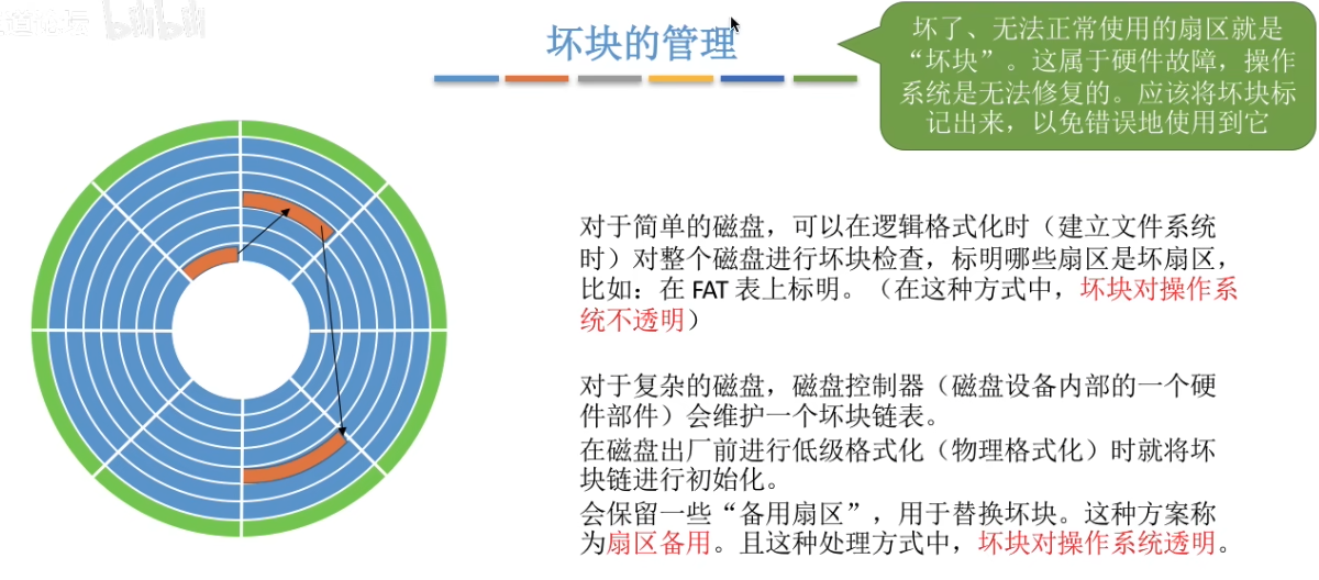 对于复杂的磁盘,磁盘控制器(磁盘设备内部的一个硬件部件)会维护一个坏块链表,并在磁盘出厂前进行低级格式化(物理格式化)时就将坏块链进行初始化。另外,磁盘控制器会保留一些"备用扇区",用于替换坏块。比如操作系统想使用一个本来已经坏掉的块,那么在硬件层次,磁盘控制器这个硬件部件就会用其中的某一个好的备用块来替换这个坏块,但是这个过程对操作系统是透明的,操作系统是不可知的。这种方案也称为扇区备用。