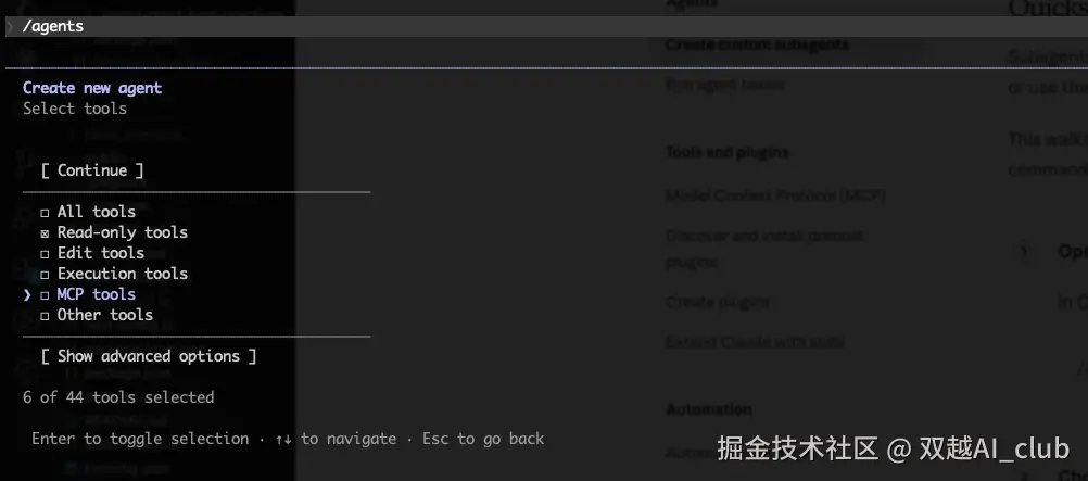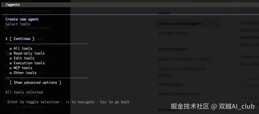 创建的时候需要写入提示词(agent 功能介绍),还需要选择 tools :all 或 read-only 等,剩下的 CC 自动帮你生成。