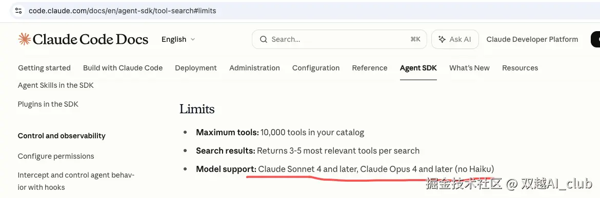 但是,目前的文档中,tool search 的使用也是有限制的,和我最相关的就是 model ,文档中只有 Sonnet 4 及其以后的模型才能支持。