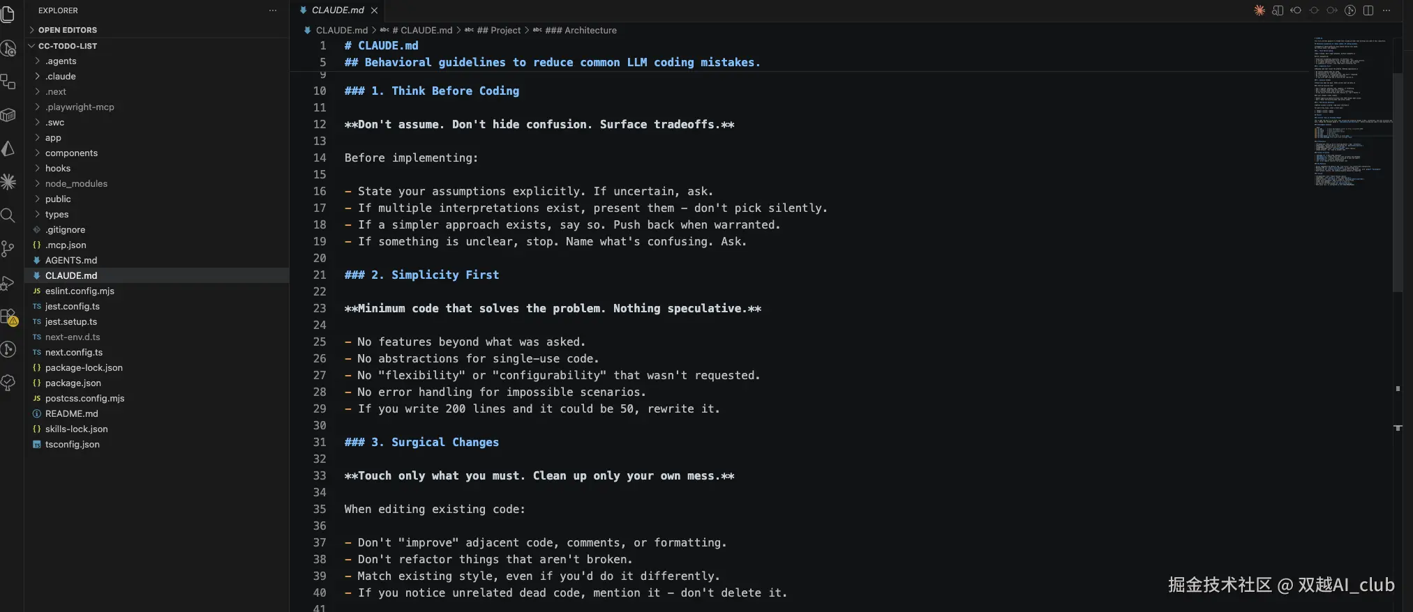 再参考 andrej-karpathy-skills 的四原则,这是最近非常火爆的 AI 编程提示次,把它补充进来。
