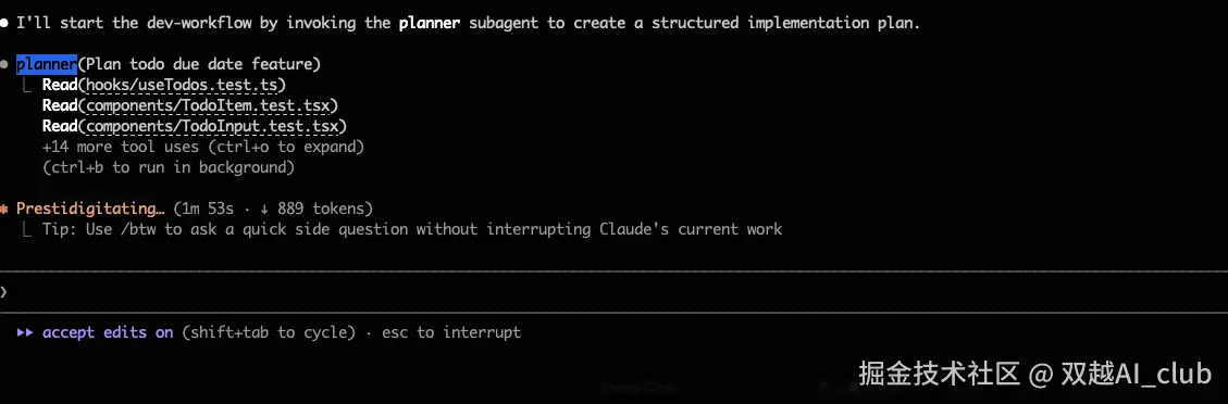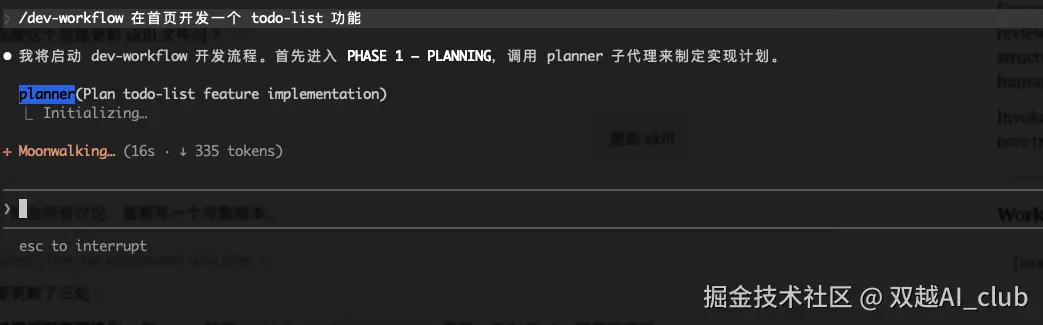 claude code 根据 dev-workflow skill 流程,自动调用 planner agent 开始工作。