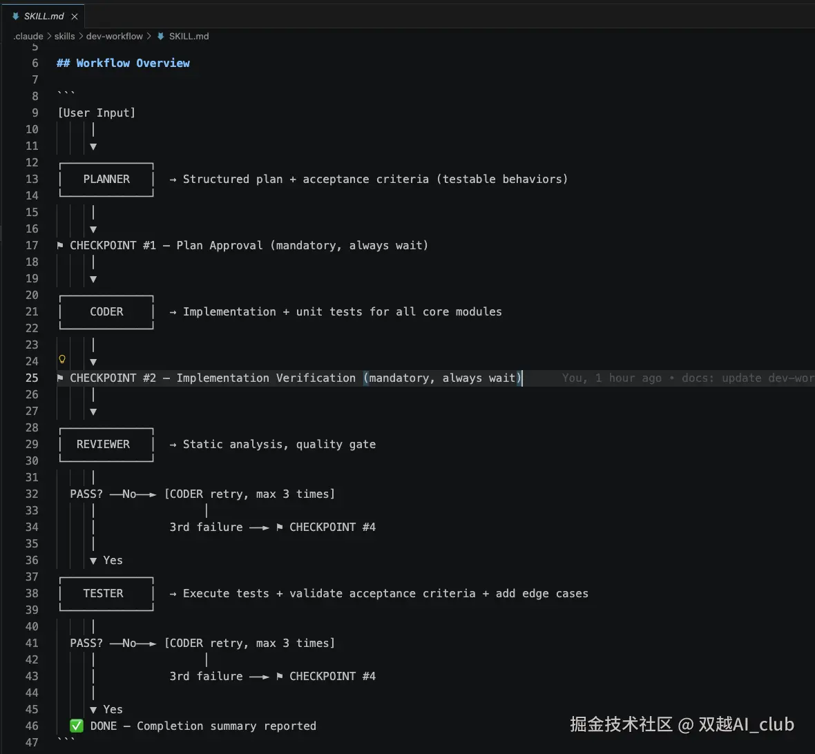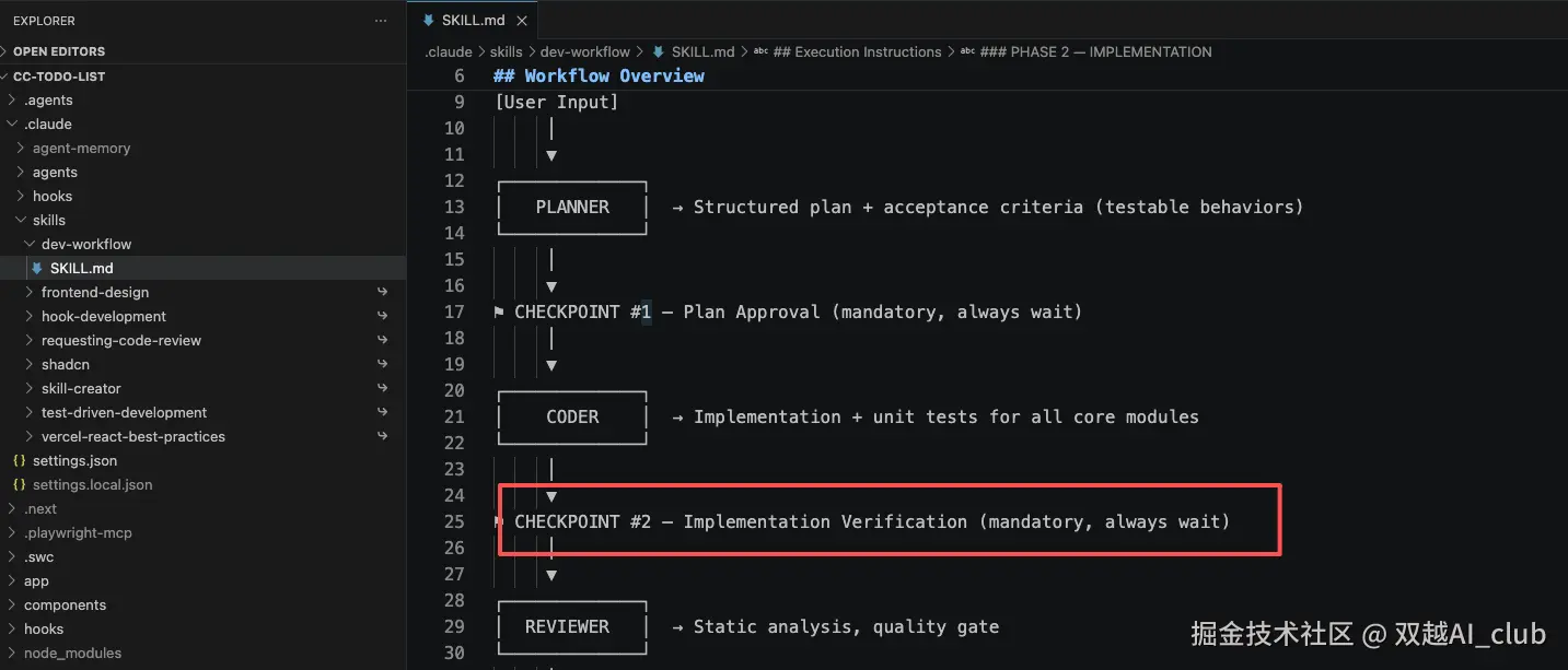 checkpoint 3 不应该停止,除非遇到问题。修改 dev-workflow skill