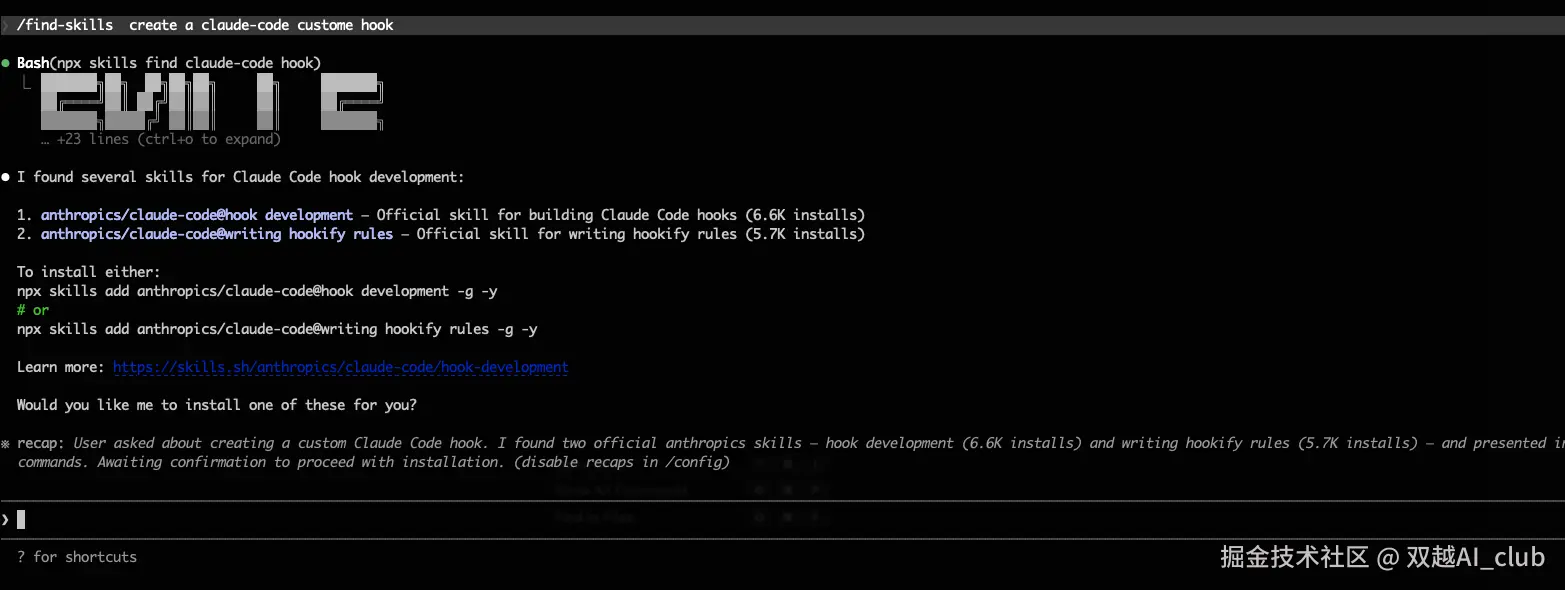 如何创建一个 hook 呢?第一步可以先搜索一下有没有相关的 skill ,在 CC 中输入