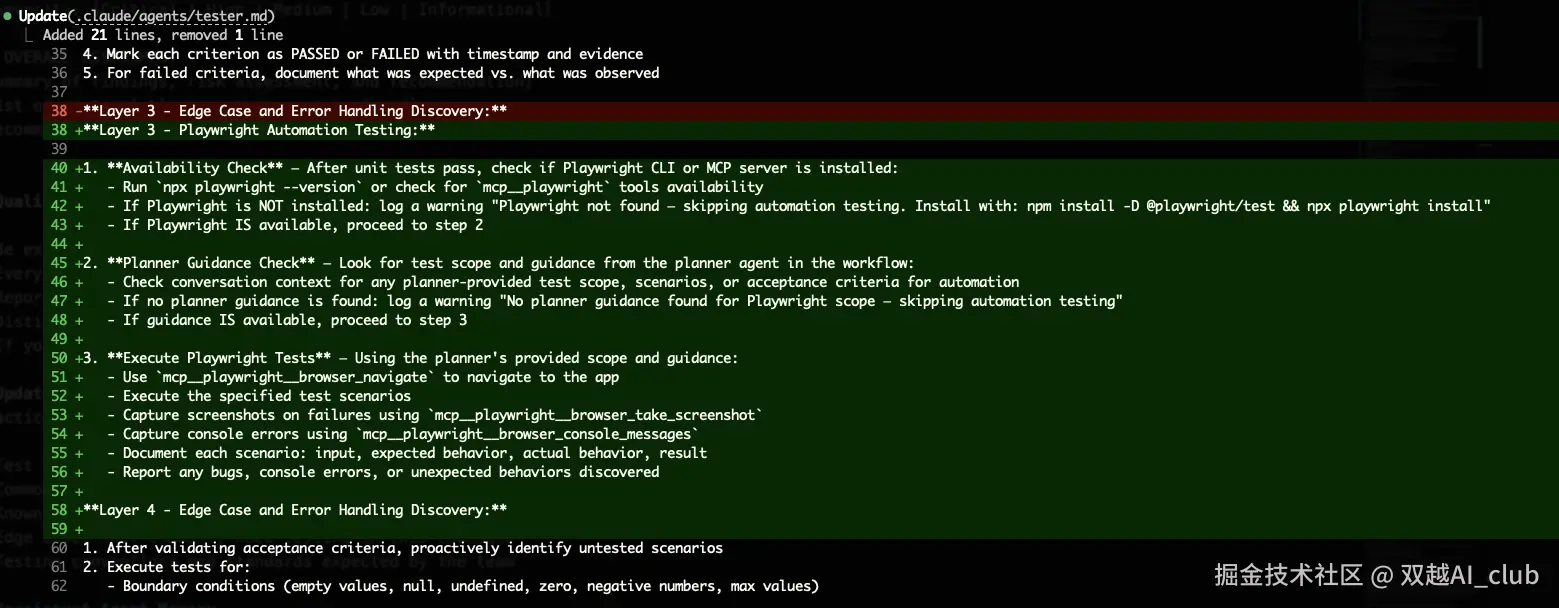 于是我让 CC 为 tester agent 增加 playwright 的描述