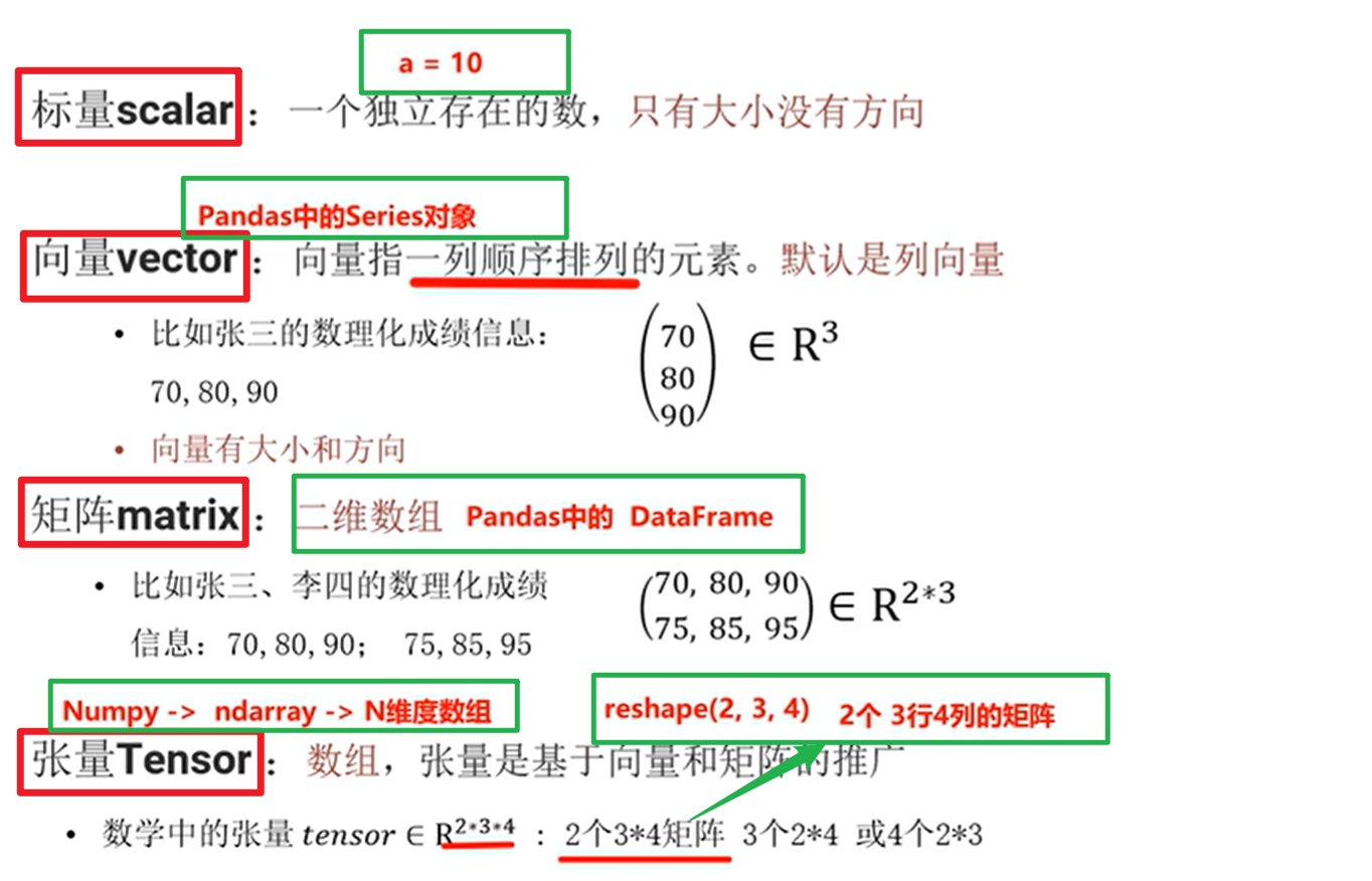 (图示:Pandas中的DataFrame只能是二维的,里面由一个个Series组成;一个值叫标量,一个个标量可组成向量(如:Pandans中的Series对象),多个向量可组成矩阵(如:Pandans中的DataFrame对象),多个矩阵可组成张量(如:Pandans中的ndarray对象);)