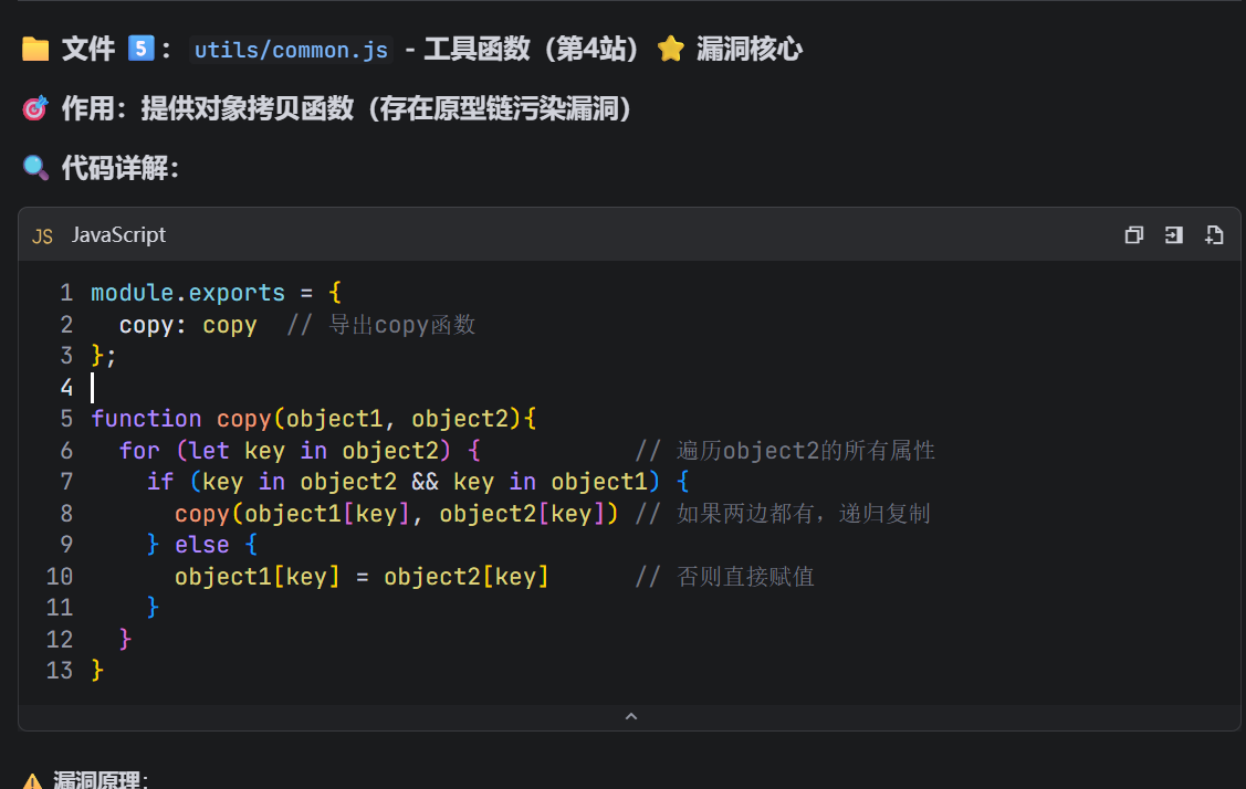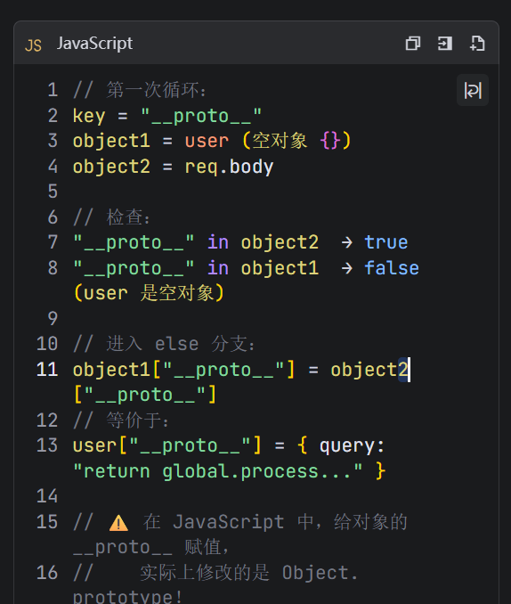 JavaScript 中所有对象都继承自 Object.prototype,而 __proto__ 是指向原型的引用。 原型链污染 = 攻击者通过可控输入(如 JSON 解析),向 Object.prototype 注入恶意属性,导致所有对象意外获得该属性,从而绕过逻辑判断或触发异常行为。