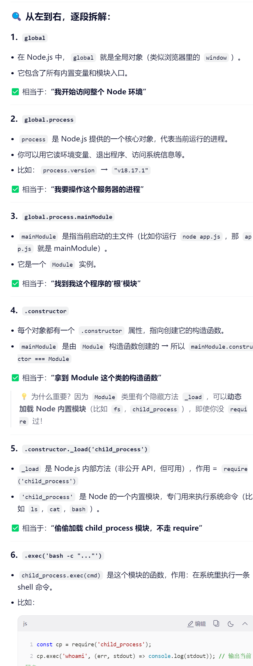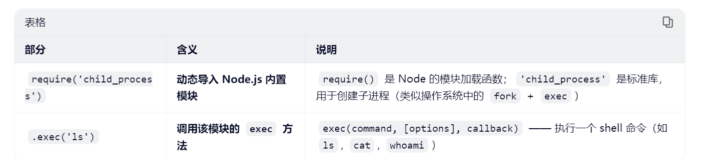 由于 Node.js 默认不会自动暴露 require 给 Function 创建的函数,因此这里用process.mainModule.constructor._load 替代 require来包含child_process