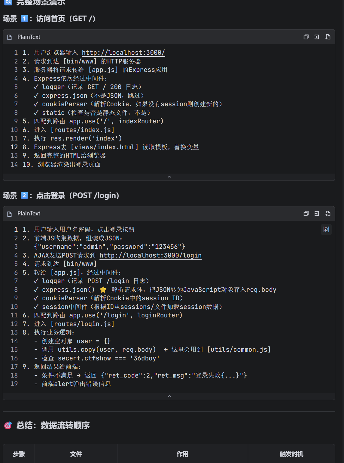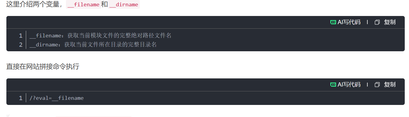 服务端根据用户输入动态拼接路径,用 require() 加载模块,但未对输入做校验,导致攻击者通过 ../ 等路径穿越,加载任意文件(如 /flag),甚至执行恶意 JS。