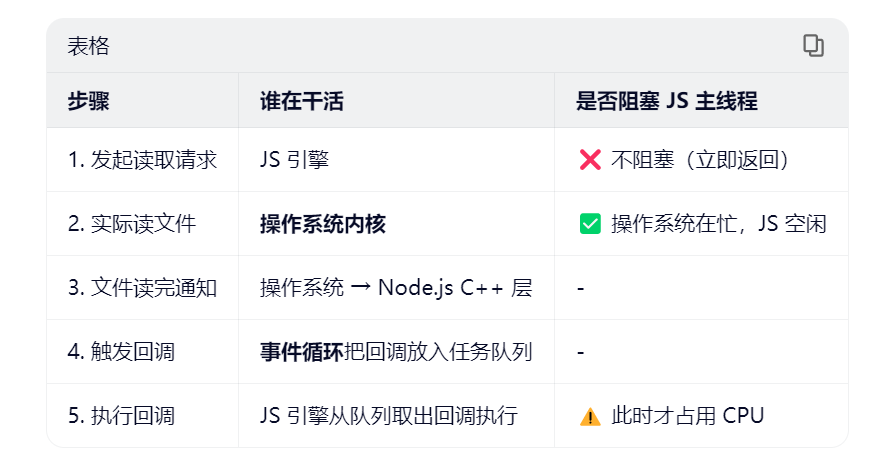 当某个异步操作(如读取文件)开始时,Node.js 不会等待它完成,而是注册一个回调函数(callback),并继续执行后续代码。