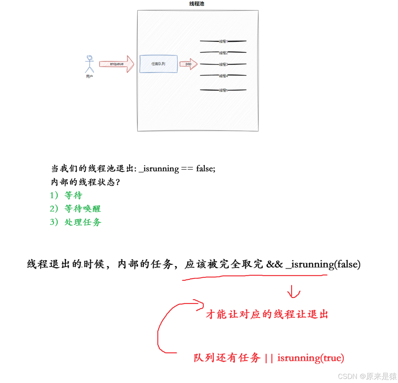 | 队列空且线程池运行中 | _taskq.empty() && _isrunning |