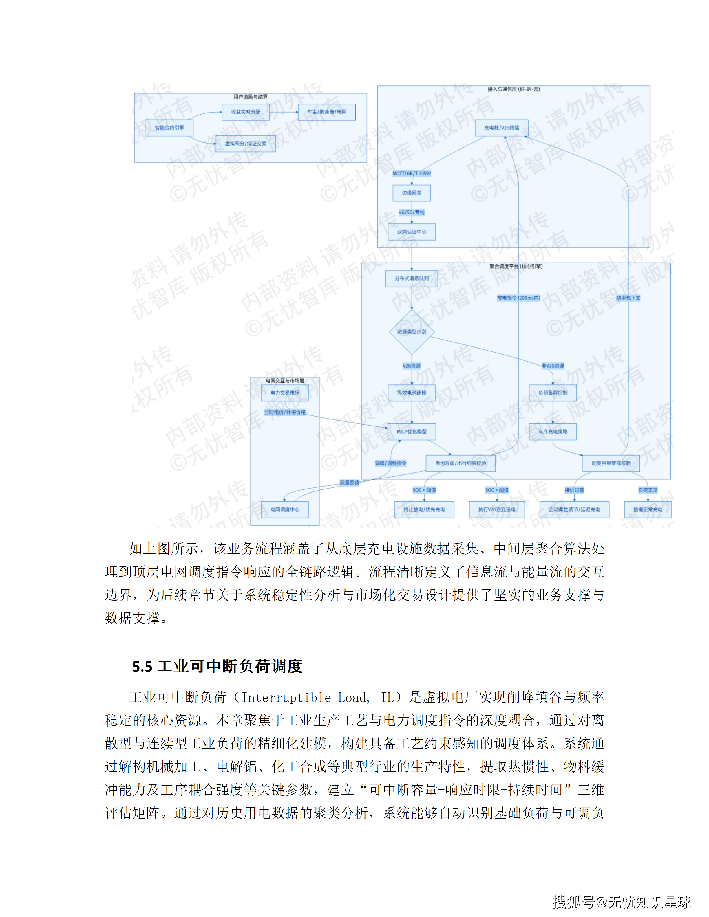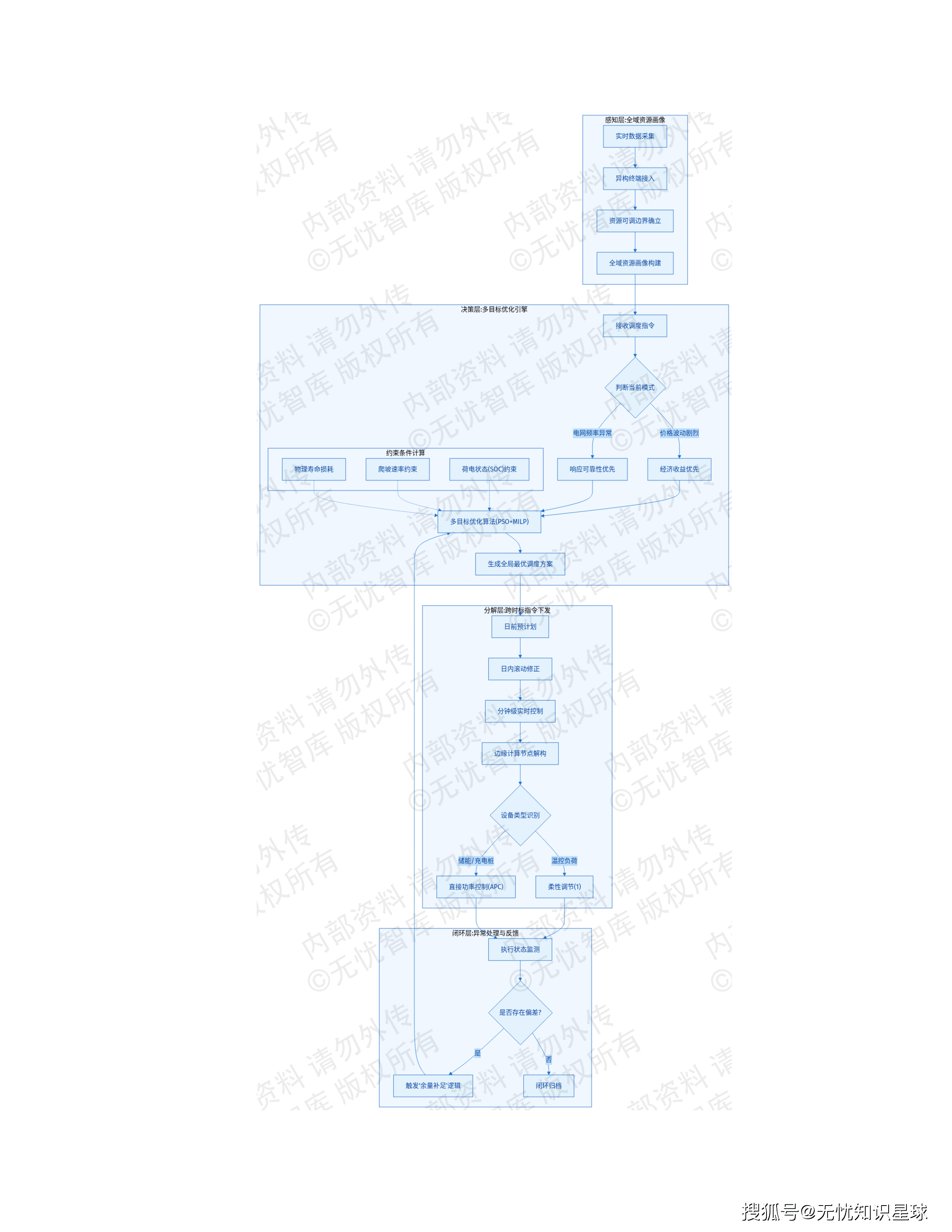 控制黑盒 :充电桩是"离散随机负荷"受限于用户行为;工业负荷受生产工艺强耦合约束(电解铝、水泥磨机等不能随意启停);分布式光伏具有强不可控性。 项目建立多智能体系统(MAS)架构的协同控制体系,为每类资源建立独立智能体,将物理约束封装为控制策略参数,仅向上层暴露"可调容量区间"和"响应速率"两个核心接口,实现底层控制复杂性与上层调度策略的有效解耦。
